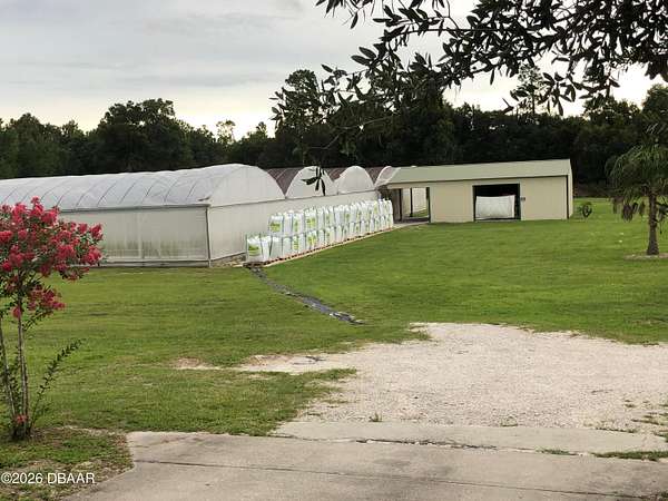 Check out this rare opportunity to own acreage that is agriculturally zoned within minutes to Downtown Deland that is set up to be a horticulturists dream! This property features a 70 x 30 metal building that includes your 2 bedroom, 1.5 bath home with a cute little front porch along with a covered parking breezeway that adjoins you to the rest of the building that is used for work space and/or storage. With over 25,000 SQFT of a professionally built greenhouse with full irrigation and an attached, covered pole barn for equipment and materials storage, you have endless possibilities! Along with this there is also a 60x37 metal barn/workshop that could be left as is or easily closed in. All of this on 5 acres that is in unincorporated Deland (no city to deal with) that already holds an ag exemption. This would be a great place to have as a working nursery where you have the potential to have a great client base with such a convenient location. The seller is leaving the home furnished as well as leaving all equipment on site, with an acceptable offer. Seller financing available. Realtors please read realtor remarks.