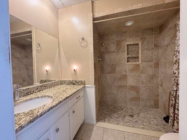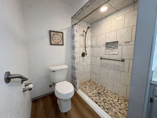 Inside, you’ll find essential updates where they matter most: granite tile countertops in the kitchen and modernized easy-entry walk-in showers in both the hall and master baths. The living area features a natural stone hearth.