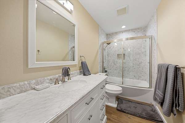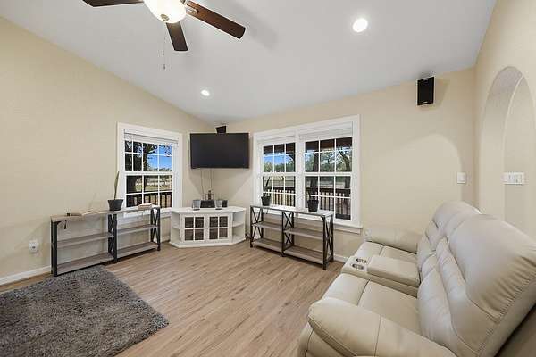 The property features a versatile third room or office, complete with its own closet and a separate private entrance. This space is well-suited for a guest suite, home office, or short-term rental, and includes an area ideal for a kitchenette setup.