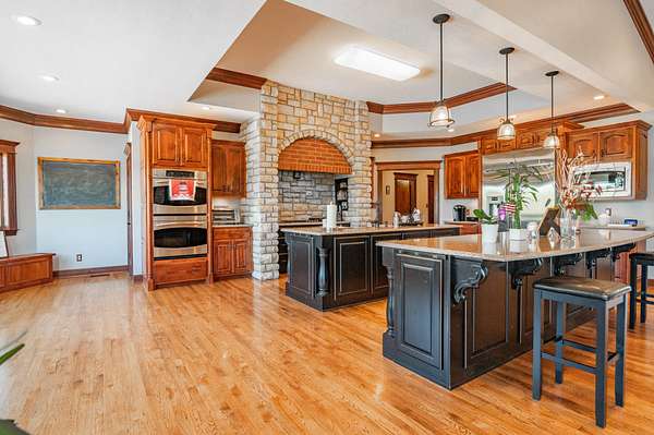 The centerpiece of this magnificent property is a sprawling, custom-built home that exudes quality and sophistication. Designed for both grand entertaining and comfortable family living, the home features a total of five generous suites. The main floor is a masterpiece of design, highlighted by a breathtaking cathedral family room that serves as the heart of the home. It flows seamlessly into a professional-grade chef's kitchen, a formal dining area, a dedicated home office, and three spacious bedrooms, including a spectacular master suite.