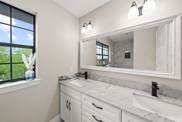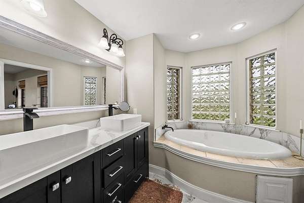 This thoughtfully designed floor plan features a serene downstairs primary suite with a decorative tray ceiling and a wall of windows, creating a light-filled retreat. The primary bath offers dual sinks, a walk-in closet, walk-in shower, and a relaxing garden tub. The impressive gourmet eat-in kitchen showcases stunning granite countertops and a sweeping island that overlooks the sophisticated dining room and comfortable living room with fireplace and a wall of windows.
