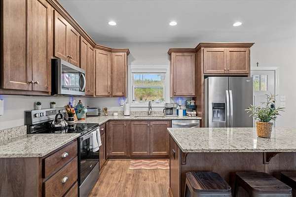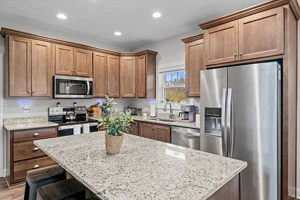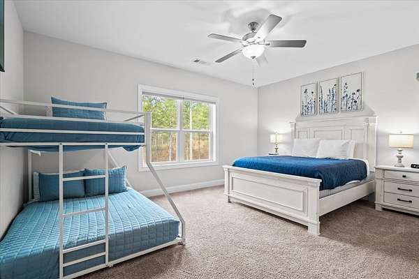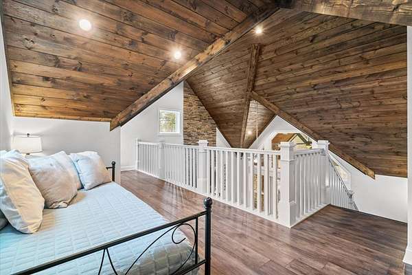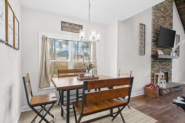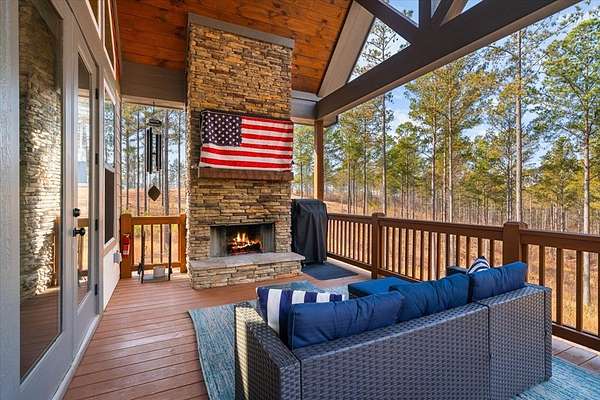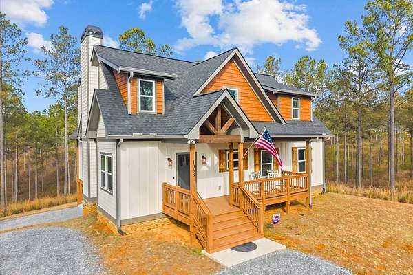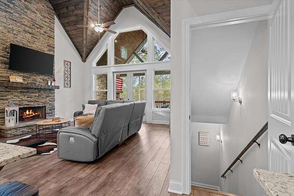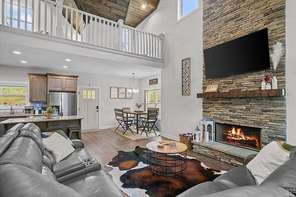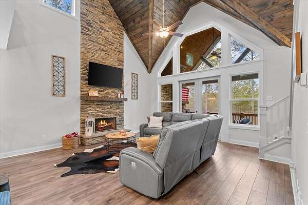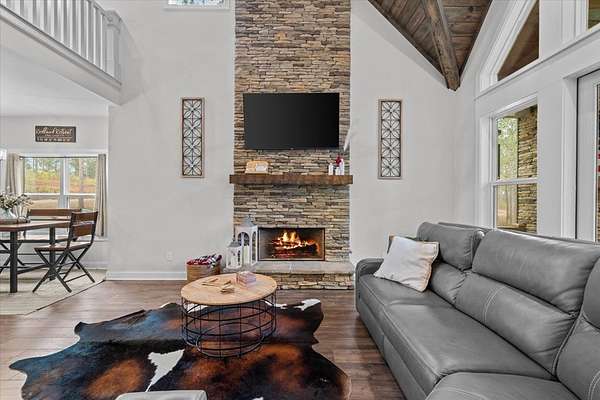 Mountain retreat with proven short-term rental appeal in the gated High River community near Ellijay. Built in 2023, this 3 bedroom, 3 bath home offers approximately 3,105 square feet of living space on 3.5 acres, combining strong income potential with an exceptional owner experience. The main level features a vaulted great room with wood-accented ceilings, stacked-stone fireplace, and an open-concept kitchen with granite countertops, stainless appliances, and a large island. A wall of windows fills the space with natural light and frames peaceful wooded views. The primary suite on the main level includes a spacious bedroom, ensuite bath, and generous closet. Upstairs offers an additional bedroom, full bath, and flex loft area overlooking the great room.