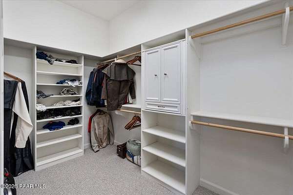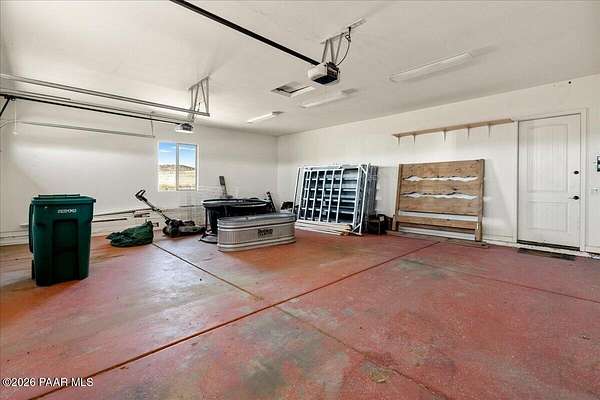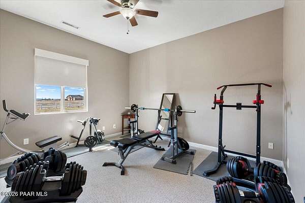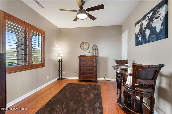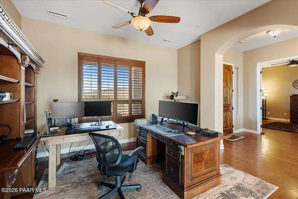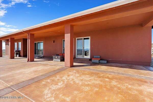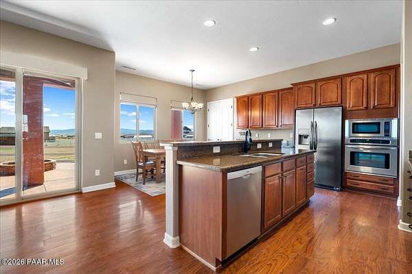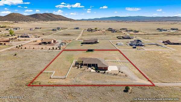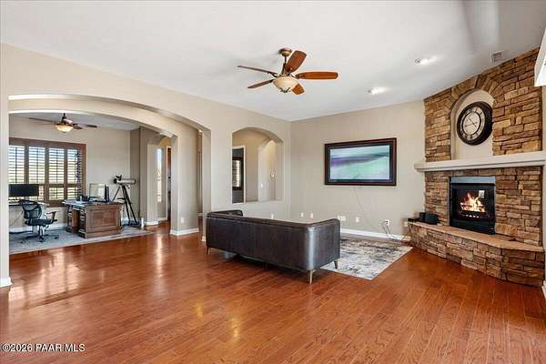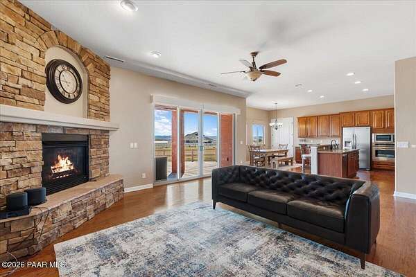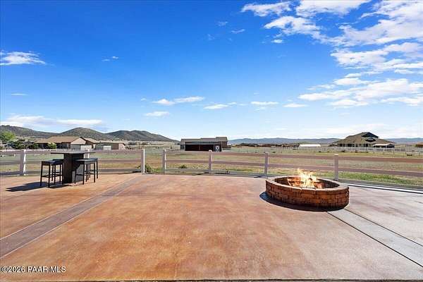 Welcome to your own slice of country living, where space, views, and freedom come together. Set on 2 usable acres in the sought-after Prescott Prairie equestrian community, this property offers private access to horse and OHV trails along with wide-open 360 views that truly set it apart. Inside, the home is designed for both comfort and connection. The spacious primary suite opens directly to the back patio, perfect for enjoying quiet mornings or evening sunsets. You'll appreciate the thoughtfully designed walk-in closet with custom organization and a spa-like ensuite featuring a jetted tub and separate walk-in shower. The heart of the home is the open living area, where the kitchen and living room flow seamlessly together, creating an ideal space for entertaining. A cozy stone gas fireplace anchors the room, while sliding doors lead provide tons of natural light and lead out to an expansive patio complete with a custom 6-foot fire pit, an incredible spot to take in those Arizona sunsets. The kitchen is well-equipped with stainless steel appliances, including a 5-burner gas cooktop, built-in oven and microwave, and a quiet Bosch dishwasher. Granite countertops, a large island with sink, and a spacious pantry make it as functional as it is inviting, all complemented by a dining area with beautiful views. Additional features include a split floor plan for added privacy, two guest bedrooms (one with its own ensuite), and an oversized laundry/mud room off the 3-car garage with ample storage and a utility sink. Hardwood flooring, arched walkways, and upgraded finishes add warmth and character throughout.