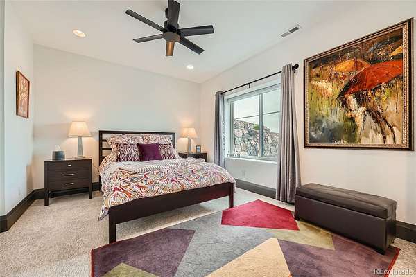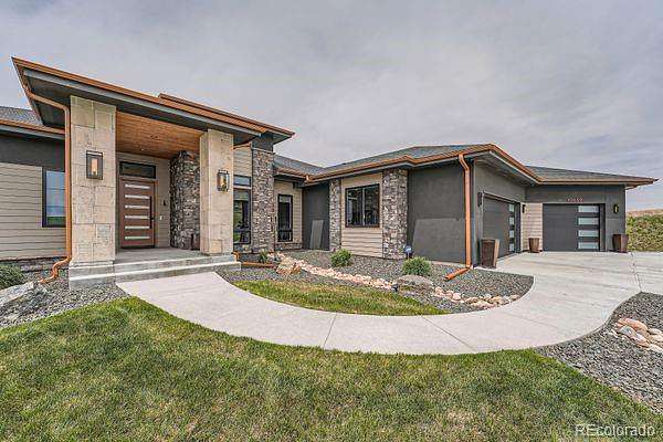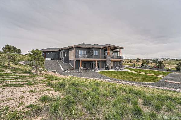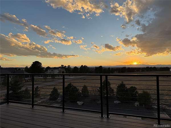 Amazing Mountain Views, Exceptional Design, & Premier Location! Perfectly set on 2+ private acres with sweeping Front Range views, this remarkable residence blends refined luxury with easy access to metro conveniences. Expansive windows and sliding glass doors frame breathtaking vistas, with open-concept living space, natural light, and stunning western sunsets. Designed for both grand entertaining and comfortable everyday living, the main level provides easy flow between the gourmet kitchen, dining, and great rooms—all opening to a massive, partially covered deck spanning the length of the home. The oversized primary suite is a true sanctuary, offering private deck access and a spa-like bath with heated floors, floating vanities, soaking tub, steam-sauna shower, and a custom walk-in closet with direct access to the laundry room. A second main-floor bedroom suite provides luxurious space for guests. A private office captures incredible mountain views and opens directly to the west-facing deck. The walkout lower level is equally impressive, featuring three additional bedrooms, two baths, a beautifully appointed media/recreation room with wet bar, and a dedicated game area. One bedroom is currently designed as a fully equipped home gym. A spacious multi-purpose utility room offers flexibility for storage, hobbies, or additional workspace. Step outside to a covered patio with gas fire pit and a backyard oasis ready for a future pool or hot tub. The 3.5-car garage provides ample space for vehicles, storage, and recreational gear. Just minutes from grocery, dining, banking, and everyday essentials, with Southlands, the town of Parker, and E-470 nearby. Quick access to Park Meadows, DIA, the Tech Center, and Downtown. Bordered by open green space to the south and surrounded by wildlife and natural beauty, this home offers a rare combination of privacy, views, luxury, and convenience. Experience elevated Colorado living at its finest. Schedule a private tour today!