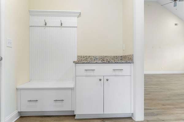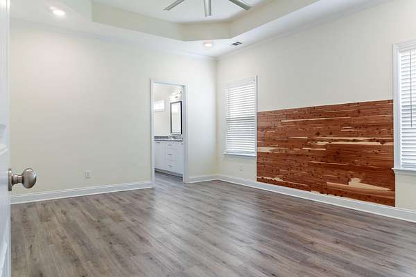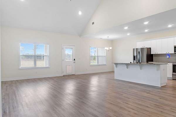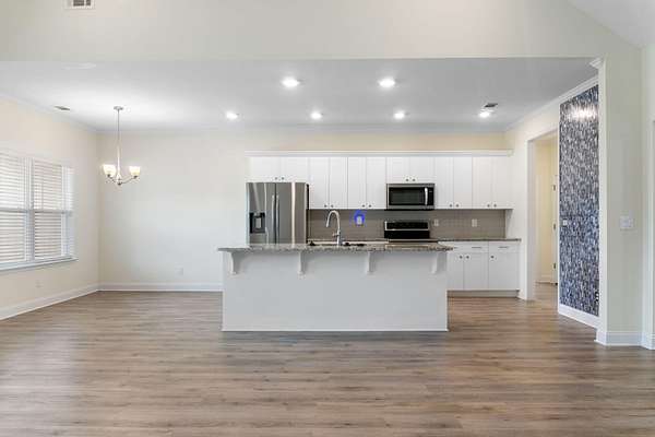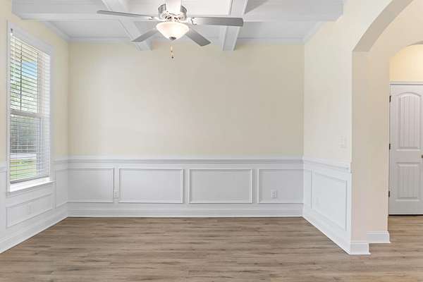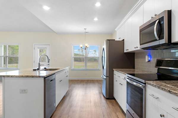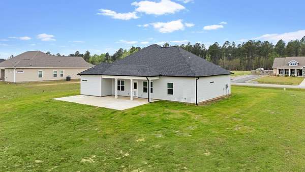 DoNotMissOut Come see this modern comfort meets space and functionality on over an acre of land! This beautifully designed 3 bedroom, 2 bath home offers the perfect blend of style and practicality. From the moment you arrive, you'll appreciate the extended concrete driveway that is ideal for extra parking, including RVs, boats, and trailers. The inviting covered rocking chair front porch is perfect to relax after a long day at work. Step inside to discover luxury plank wood look vinyl flooring flowing throughout the home, complemented by tons of recessed lighting. The spacious great room features vaulted ceilings, creating an open and airy feel that's perfect for both relaxing and entertaining. The dining room is a true showstopper with coffered ceilings and classic judge's paneling, adding an elegant touch for gatherings. The kitchen is equally impressive, boasting granite countertops, a sleek grey gloss subway tile backsplash, stainless steel appliances, and a large island with seating for four. A bright breakfast area overlooks the expansive backyard, offering peaceful views of your private outdoor space. The thoughtfully designed layout includes a convenient cubby drop zone off the garage that is perfect for coats and everyday organization as well as a laundry room with cabinet storage and a folding area. The owner's suite is a relaxing retreat featuring tray ceilings with recessed lighting. The en suite bathroom includes a walk in closet, dual granite vanities, a garden tub with ceramic tile surround, and a separate tiled shower. The secondary bathroom offers dual vanity sinks, framed mirrors, and a shower/tub combo that is perfect for family or guests. Step outside to enjoy the covered rear patio with an additional concrete extension. This space is ideal for outdoor entertaining, grilling, or simply enjoying your wide open space. If you're looking for modern features, thoughtful design, and room to spread out this property checks all the boxes. Don't miss your opportunity to call this one home!