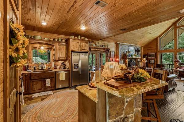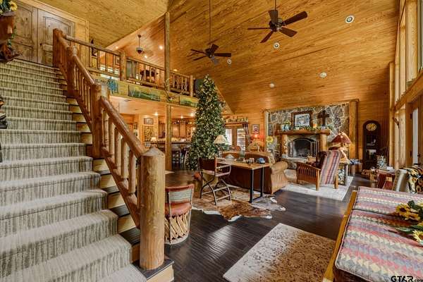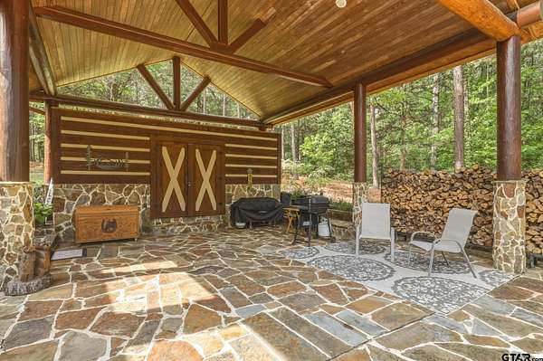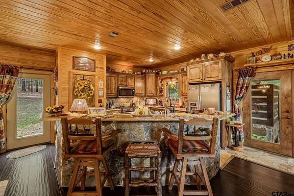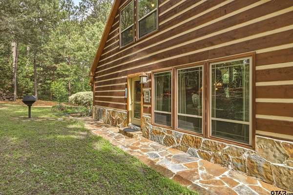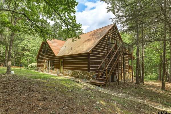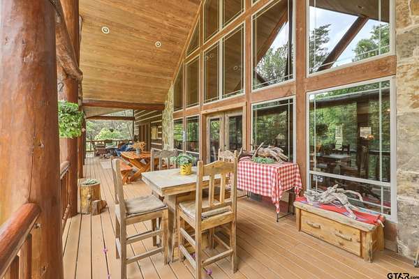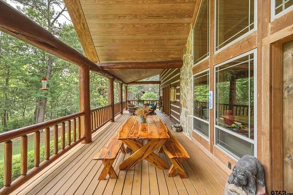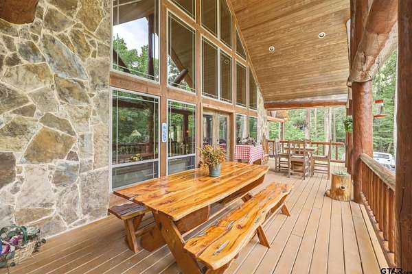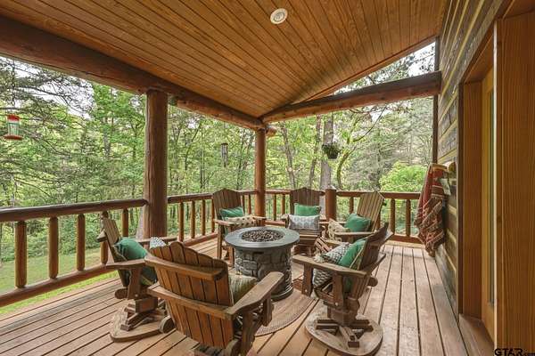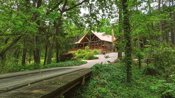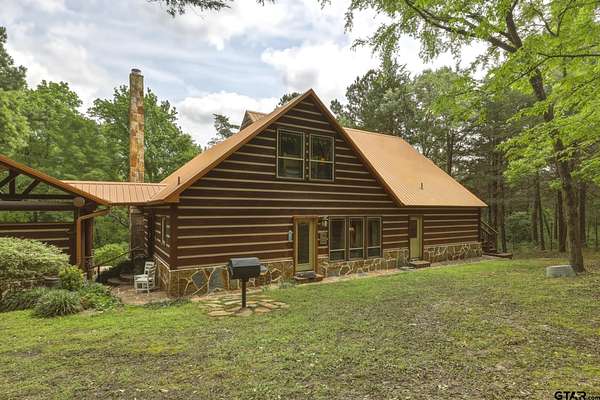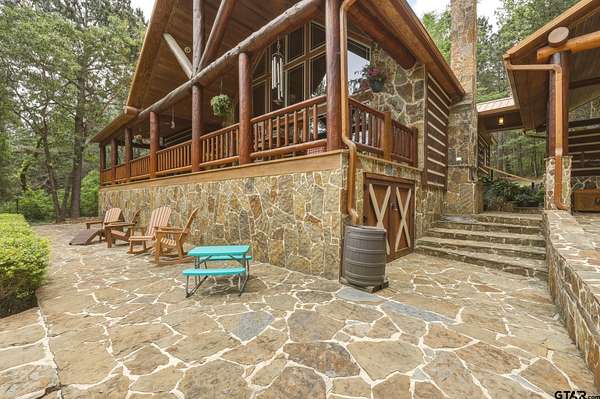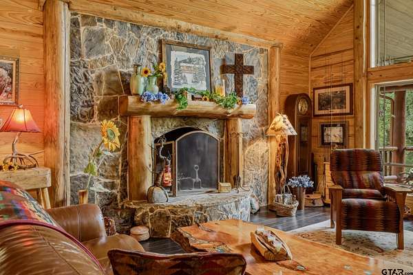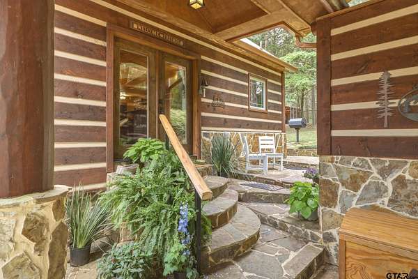 “Location, location, location.” Set within one of the area’s most desirable and established corridors along FM 2137, this property is a place where serene, picturesque surroundings, lush, tranquil landscape, and the gentle presence of an ever-flowing freshwater stream, come together to create something truly special. The land itself feels like a private sanctuary. Ten and a half wooded acres create a peaceful, secluded haven where wildlife roams freely and nature flourishes, offering a setting that is both tranquil and breathtaking in every season. Crafted entirely of wood with no sheetrock, this exquisite, beautifully crafted log home exudes authentic lodge-style character, rich with warmth and texture. Spanning approximately 3,300+ square feet, the home blends timeless rustic charm with modern livability—equally suited for a full-time residence or a restorative weekend getaway. Inside, soaring vaulted ceilings and a wood-burning fireplace anchor the heart of the home, creating an inviting and intimate atmosphere. Seven fire features—including interior fireplace, fireboxes, and an outdoor grill—offer cozy gathering spaces throughout, enhancing both quiet evenings and memorable entertaining. Expansive covered porches and open-air seating areas are thoughtfully positioned to embrace the surrounding landscape, inviting you to slow down and take in the sights and sounds of nature. The kitchen is well-appointed with granite countertops, stainless steel appliances, and abundant cabinetry, while the primary suite provides a spacious and private retreat. Additional bedrooms, flexible living spaces, and ample storage ensure comfort and functionality throughout. With deeded paved road access, the property remains easily accessible while preserving its sense of peaceful seclusion. Select lodge-style furnishings are negotiable, offering the potential for a seamless, turnkey transition. This isn’t just a house…it’s an experience.