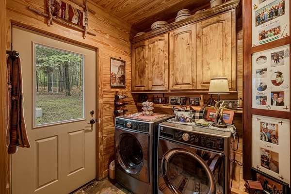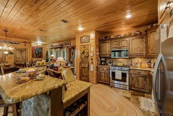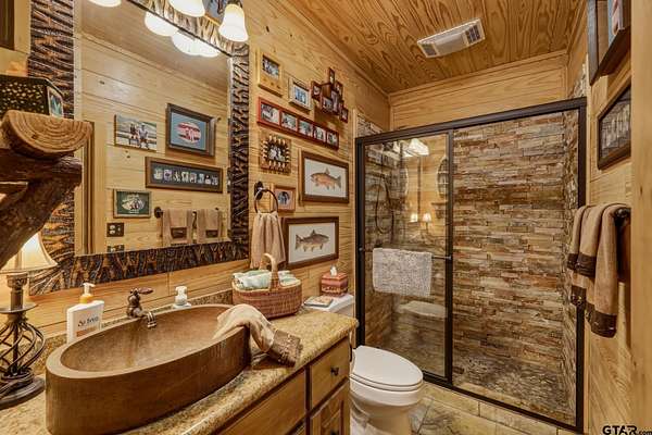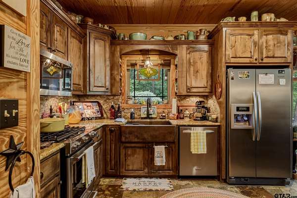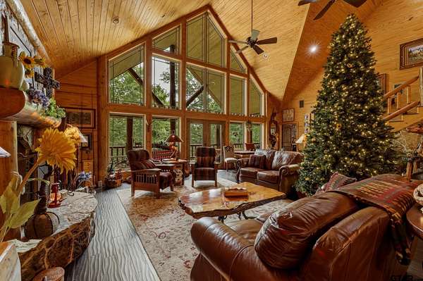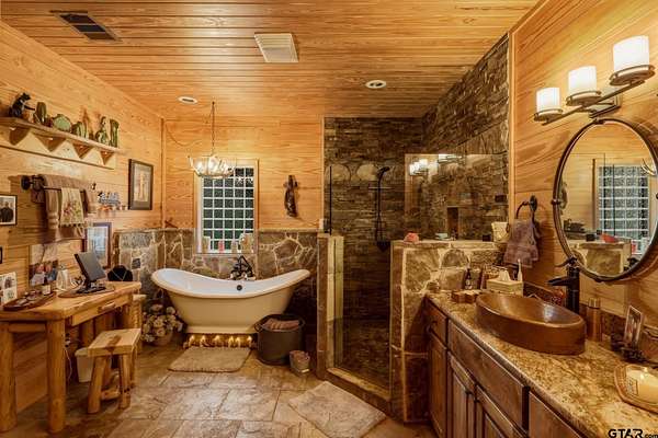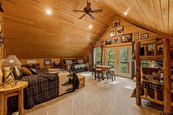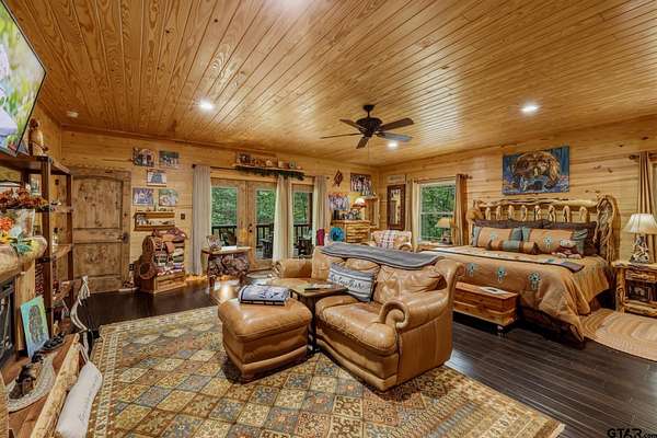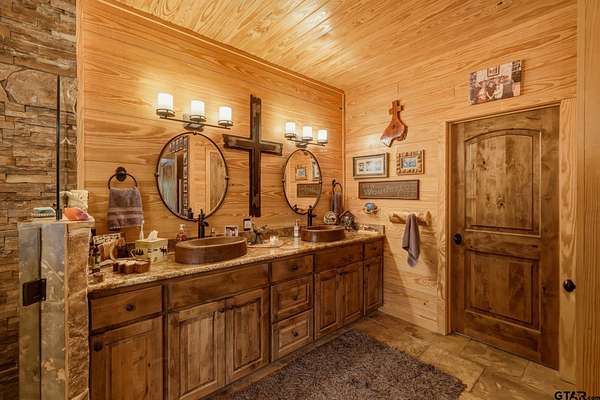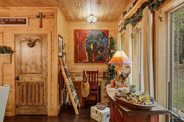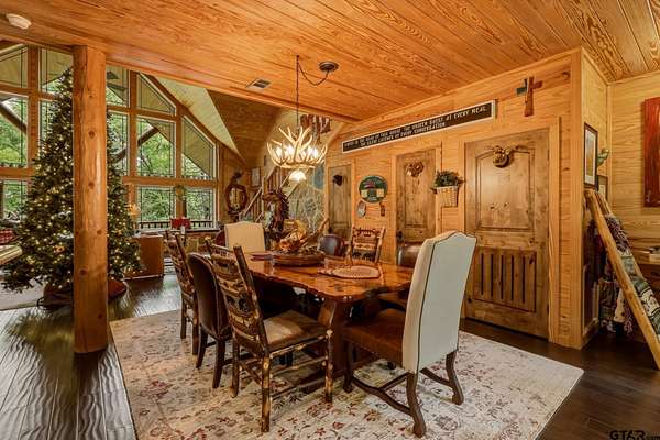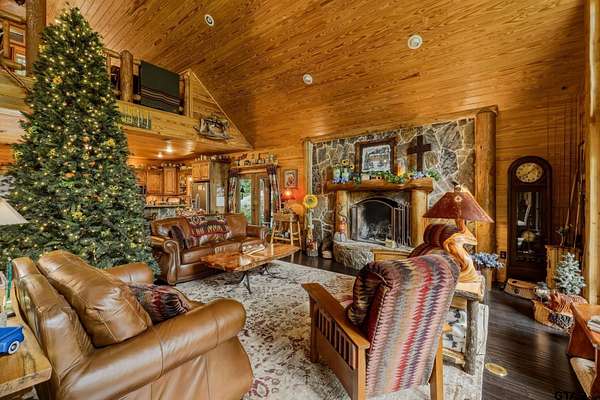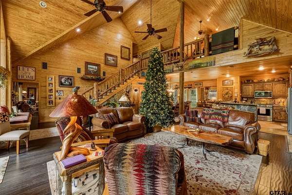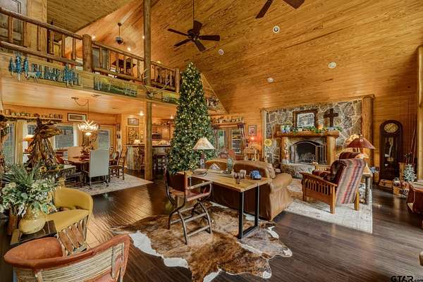 “Location, location, location.” Set within one of the area’s most desirable and established corridors along FM 2137, this property is a place where serene, picturesque surroundings, lush, tranquil landscape, and the gentle presence of an ever-flowing freshwater stream, come together to create something truly special. The land itself feels like a private sanctuary. Ten and a half wooded acres create a peaceful, secluded haven where wildlife roams freely and nature flourishes, offering a setting that is both tranquil and breathtaking in every season. Crafted entirely of wood with no sheetrock, this exquisite, beautifully crafted log home exudes authentic lodge-style character, rich with warmth and texture. Spanning approximately 3,300+ square feet, the home blends timeless rustic charm with modern livability—equally suited for a full-time residence or a restorative weekend getaway. Inside, soaring vaulted ceilings and a wood-burning fireplace anchor the heart of the home, creating an inviting and intimate atmosphere. Seven fire features—including interior fireplace, fireboxes, and an outdoor grill—offer cozy gathering spaces throughout, enhancing both quiet evenings and memorable entertaining. Expansive covered porches and open-air seating areas are thoughtfully positioned to embrace the surrounding landscape, inviting you to slow down and take in the sights and sounds of nature. The kitchen is well-appointed with granite countertops, stainless steel appliances, and abundant cabinetry, while the primary suite provides a spacious and private retreat. Additional bedrooms, flexible living spaces, and ample storage ensure comfort and functionality throughout. With deeded paved road access, the property remains easily accessible while preserving its sense of peaceful seclusion. Select lodge-style furnishings are negotiable, offering the potential for a seamless, turnkey transition. This isn’t just a house…it’s an experience.