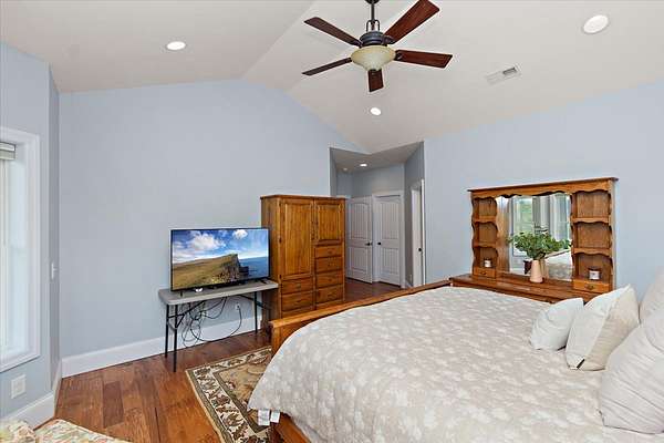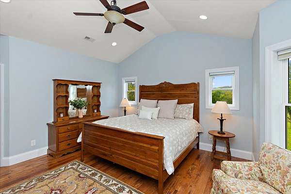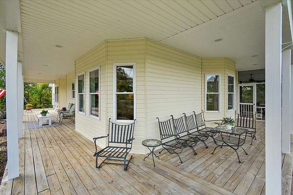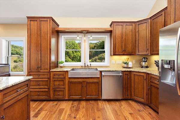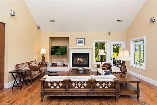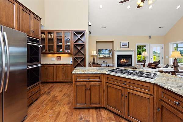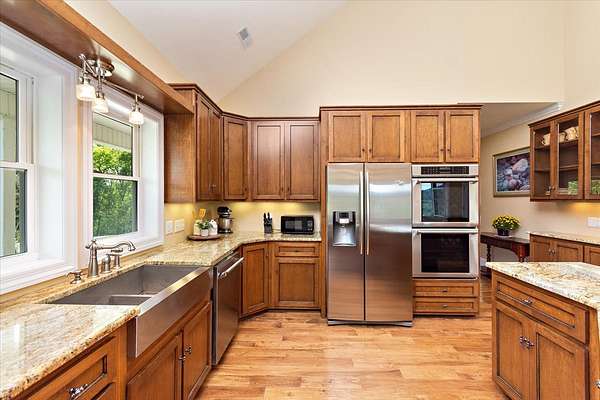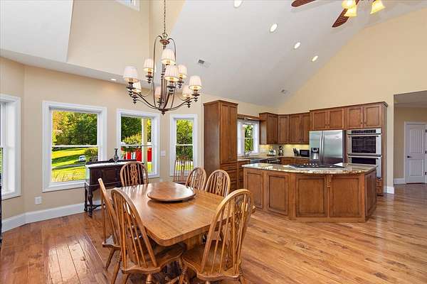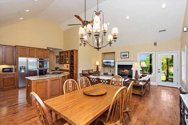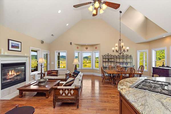 Step onto the welcoming front porch and feel instantly at home, surrounded by serene landscapes that invite you to slow down and savor the moment. Inside, the heart of the home is a chef's kitchen featuring granite countertops, a spacious island with gas cooktop, double ovens, a farmhouse sink, rich wood cabinetry, pantry and a built-in wine rack. The open-concept living and dining areas are filled with warmth and natural light, highlighted by vaulted ceilings, a fireplace and expansive picture windows that frame the stunning views. Gleaming hardwood floors flow throughout the home adding timeless appeal.