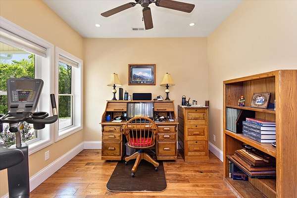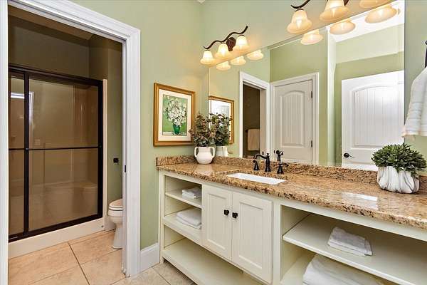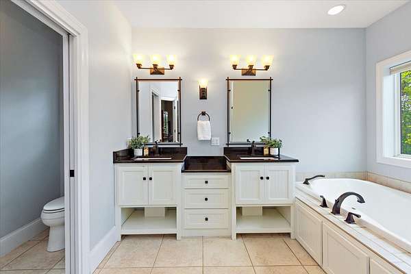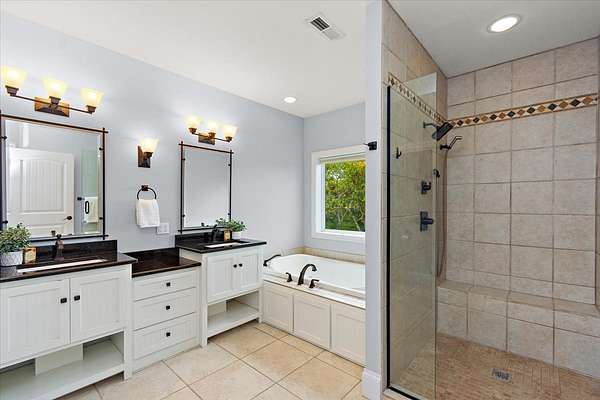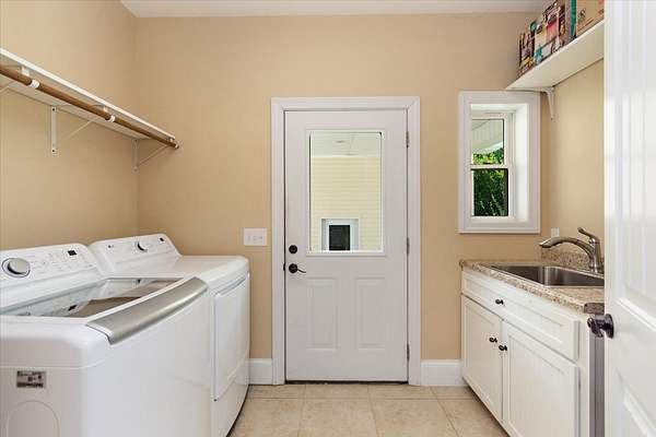 The owner's suite boasts vaulted ceilings, a charming bay window, walk-in closet, and a spa-like bath featuring a soaking tub, a walk-in shower, and dual-sink vanity accented with sleek hardware. Two additional bedrooms and a well-appointed guest bath offer comfortable accommodations for family or visitors. One of the bedrooms, with a double-door entry, is perfectly suited for use as a home office. Additional features include a dedicated laundry room with open shelving, utility sink and direct access to the covered breezeway.