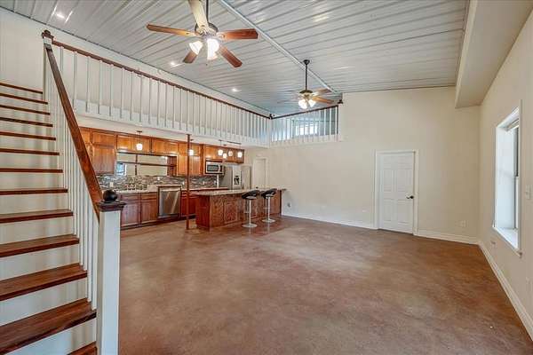 Inside, the home features tall ceilings, abundant natural light, stained concrete floors, and an open-concept layout perfect for gatherings. The kitchen with large island flows seamlessly into the living area and includes a walk-in pantry and easy-access dishwasher. Two large bedrooms are downstairs, with two open loft bedrooms upstairs. A washer and dryer closet is conveniently located near the kitchen, with additional storage under the stairs.