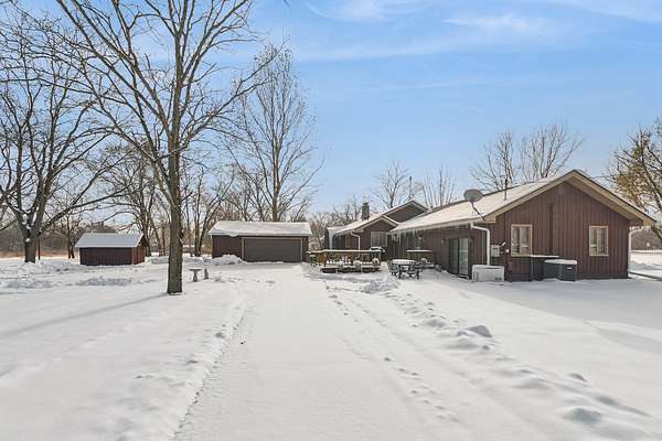 Welcome to this 3 bedroom, 2 full bathroom ranch home sitting on 2.5 acres. As you enter the property, note the large circular driveway and covered front porch perfect to relax and enjoy some quiet, country living. Front foyer opens up to a large, sunlit living room with focal fireplace and built in shelving. Hallway off the living room features 2 bedrooms and a full bathroom. Primary bedroom is also located off the living room offering a private full bathroom, dressing area and sauna. As you continue through this spacious home, don't miss the large laundry room with washer, dryer and utility sink along with plenty of storage and direct access to the detached 2.5 car garage. Cozy, country kitchen features refrigerator, stove, dishwasher and pantry. Directly off the kitchen you will find a separate dining room with double sliding doors leading out to a large deck ideal for indoor/outdoor living. The home doesn't end there! Large family room features a fireplace, bar area and another set of sliding doors to an additional back patio perfect for all your entertaining needs. Backyard also features separate driveway to your 2.5 car garage and storage shed to satisfy all your storage needs. If space and privacy is what you are looking for, this home hits all the boxes. Schedule your showing today!