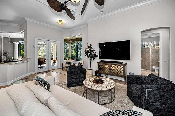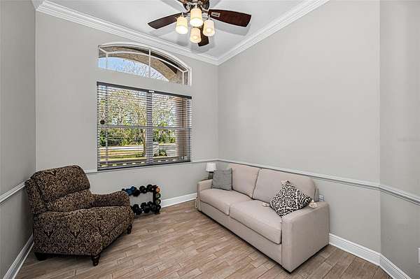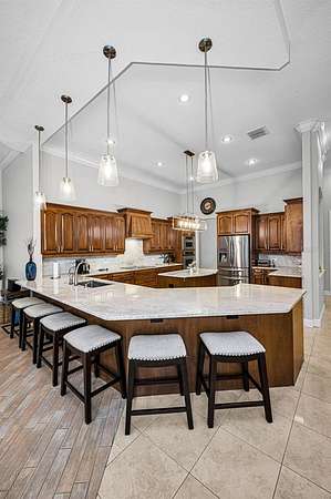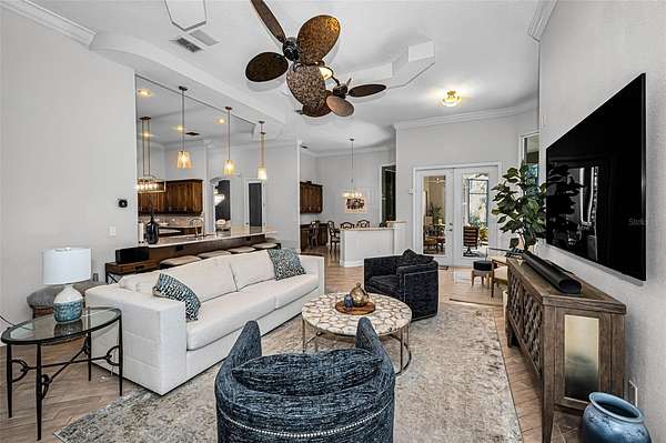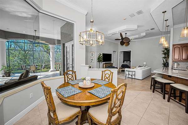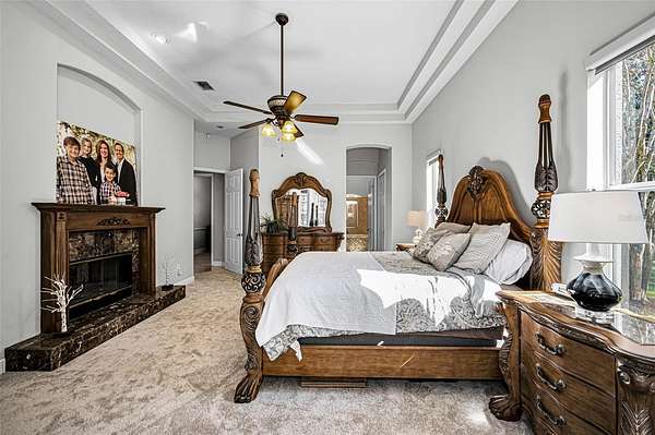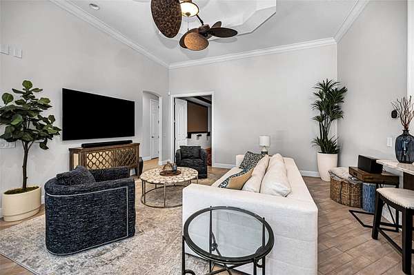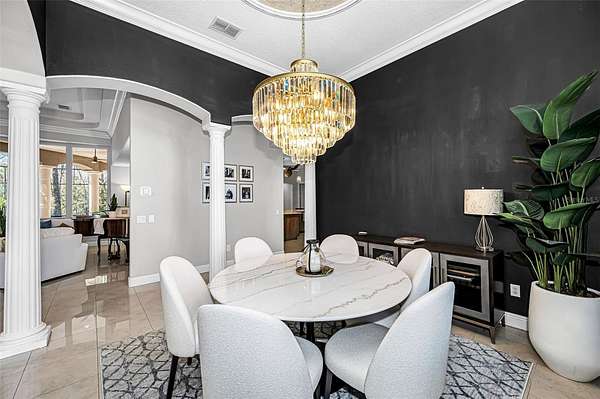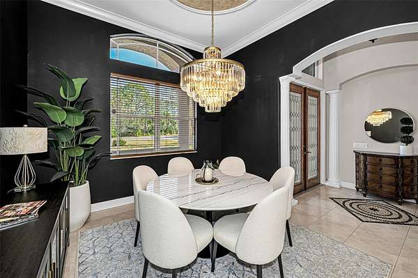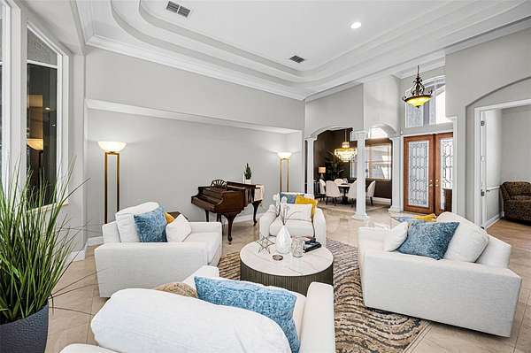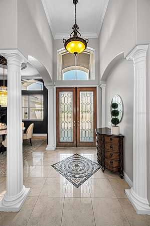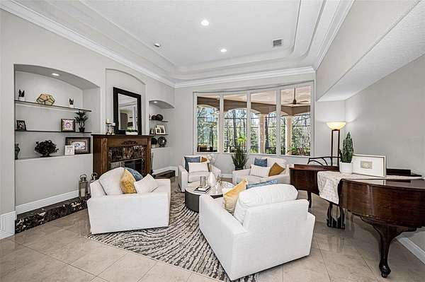 Impressive curb appeal begins with dual brick paver driveways, a grand double-door entry, and an elegant tile roof. Inside, you'll find tile flooring throughout the main living areas, crown molding, tray ceilings, decorative niches, and a fireplace in the formal living room. A separate dining room, spacious family room filled with natural light, and a dedicated office create an ideal layout for both everyday living and entertaining.