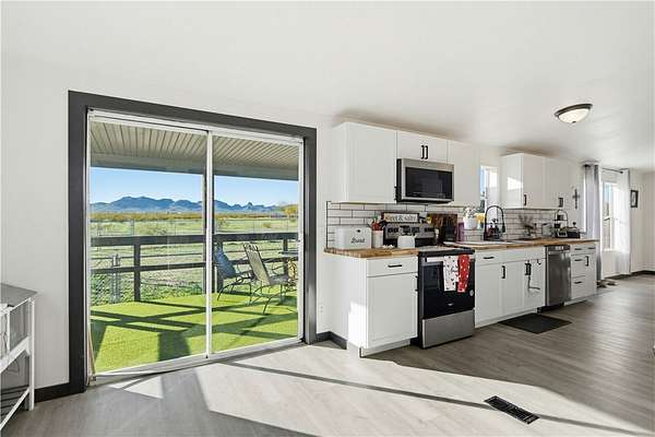 Experience peaceful desert living with wide-open space and breathtaking scenery in this fully remodeled 5-bedroom, 3-bath home situated on 10 sprawling acres in Golden Valley. No detail was overlooked - the home features a brand-new roof, new insulation under the home, new duct work, fresh interior and exterior paint, new cabinetry, new flooring throughout, updated hardware, and new countertops, offering a modern, move-in-ready feel. The spacious layout provides plenty of room for family, guests, or a home office, while the expansive land offers endless possibilities - bring your toys, animals, or simply enjoy the freedom of open space. A detached 2-car garage adds convenience and extra storage. Enjoy true country living with free-range cows and donkeys, quiet surroundings, and stunning desert and mountain views in every direction. If you're looking for privacy, tranquility, and a beautifully updated home with room to breathe, this property delivers it all.