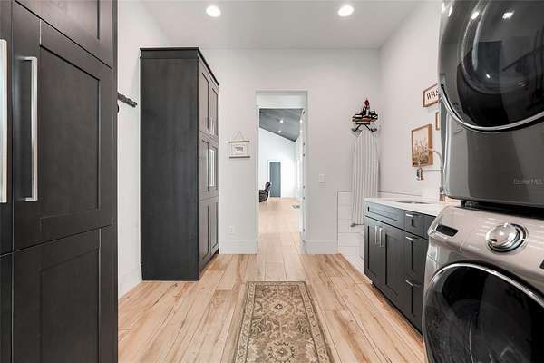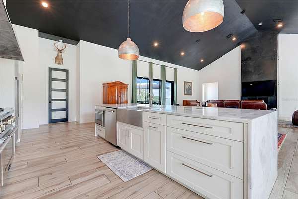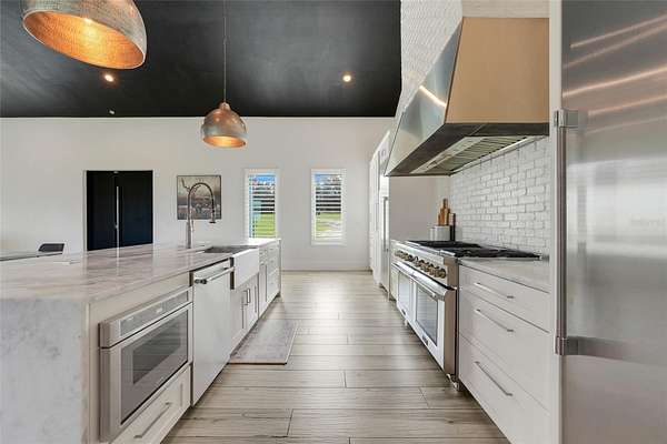 The primary suite is a serene retreat with an oversized rainfall shower, concrete soaking tub, custom dual vanities, oversized walk-in closet with custom built-ins, and a private balcony perfect for enjoying the incredible sunset views. Step outside to discover a fully equipped 1,412 sq ft garage with an RV/boat-height door--ideal for storing your toys for adventures. The garage's ample space is perfect for housing a boat to take advantage of the nearby Clermont Chain of Lakes and its stunning network of waterways. The property also includes an oversized custom chicken coop, inviting you to embrace the rural lifestyle with convenience and comfort.