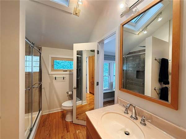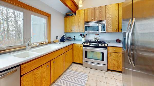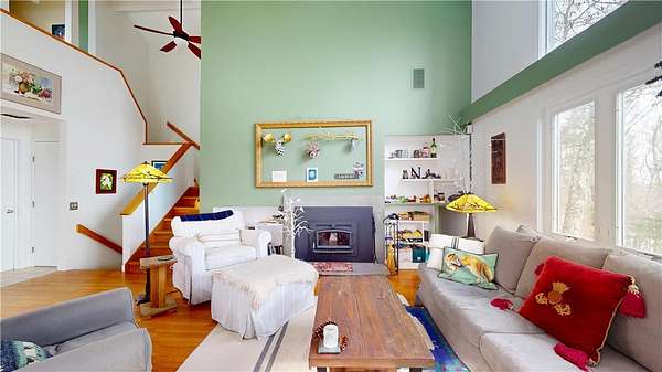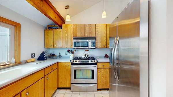 - Bar, Cathedral Ceilings, Ceiling Fans, Home Office, Kitchen Family Room Combo, Natural Woodwork, Pantry, Skylights, Sliding Glass Doors, Solid Surface Counters