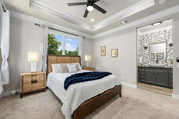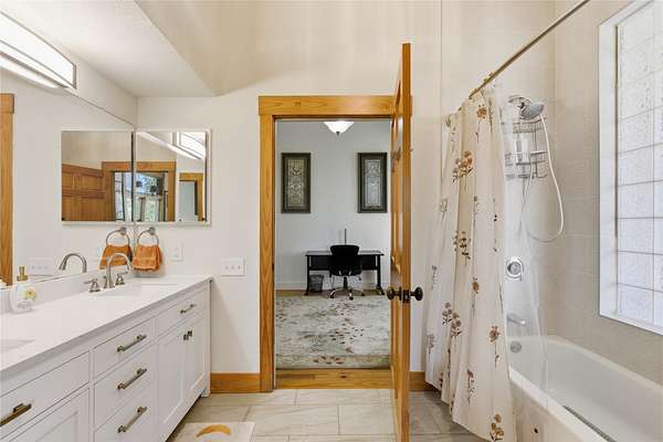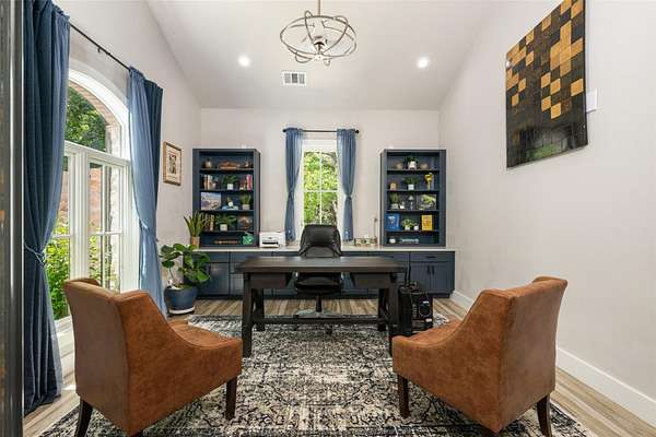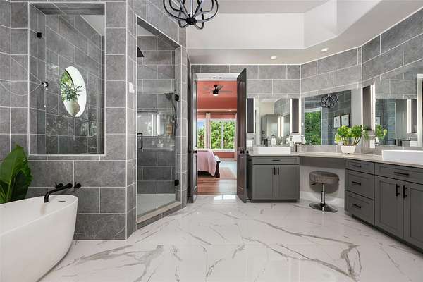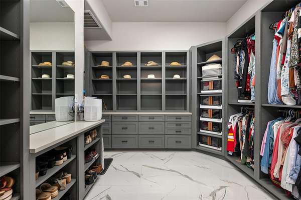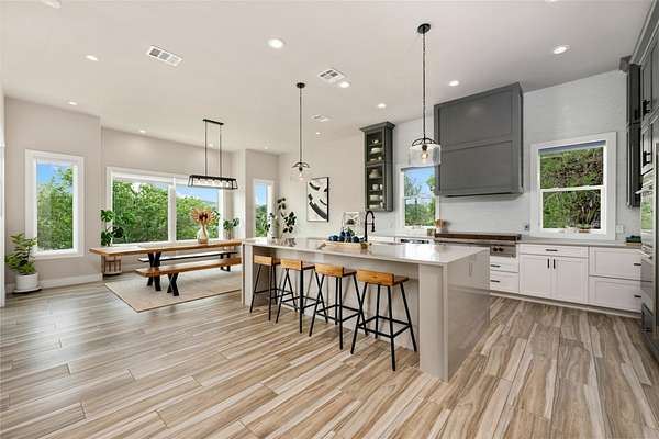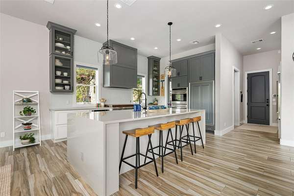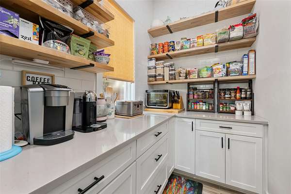 - Bookcases, Breakfast Bar, Built-In Features, Ceiling Fan(s), Ceiling-High, Eat-In Kitchen, Kitchen Island, Natural Woodwork, Open Floorplan, Pantry, Primary Bedroom On Main, Quartz Counters, Recessed Lighting, Smart Thermostat, Soaking Tub, Study/Home Office, Tray Ceiling(s), Two Primary Baths, Two Primary Closets, Two Primary Suties, Walk-In Closet(s), Wet Bar, Wired For Data