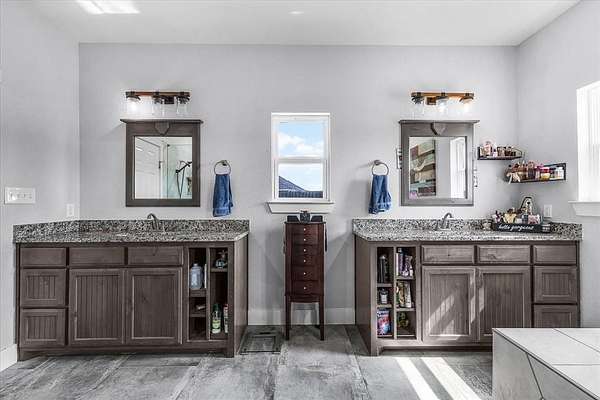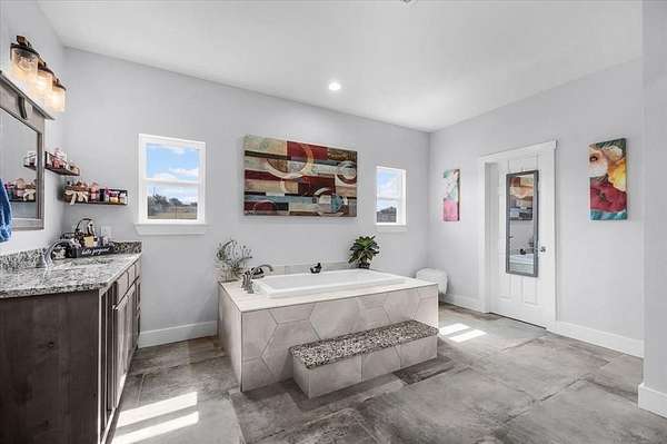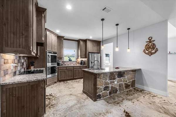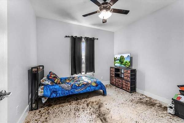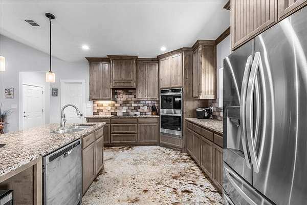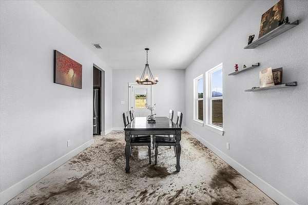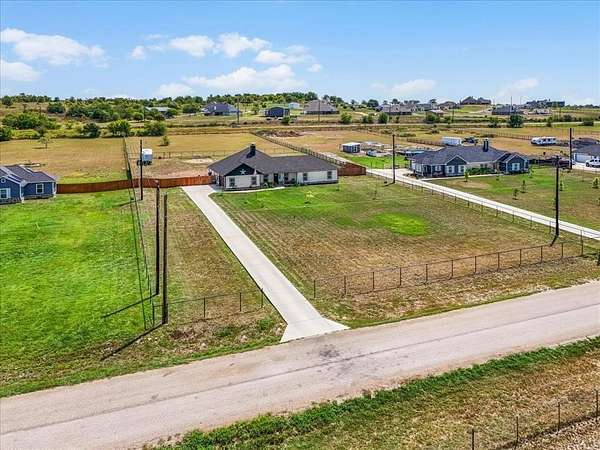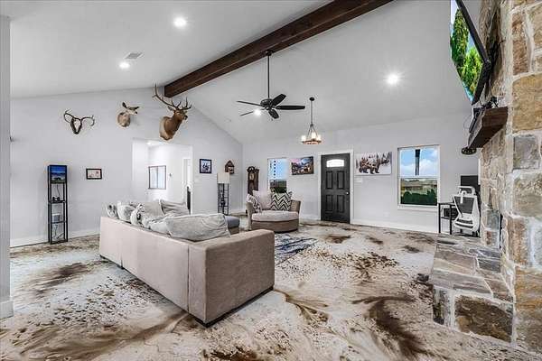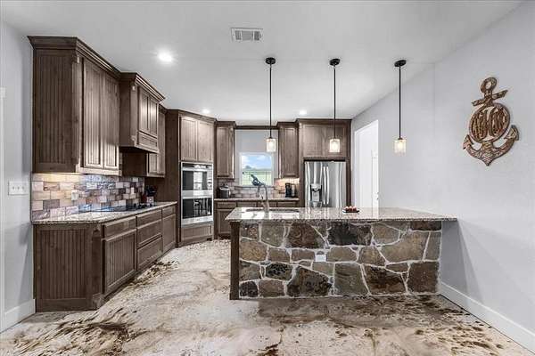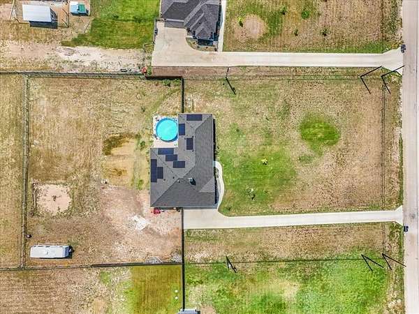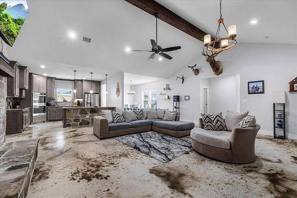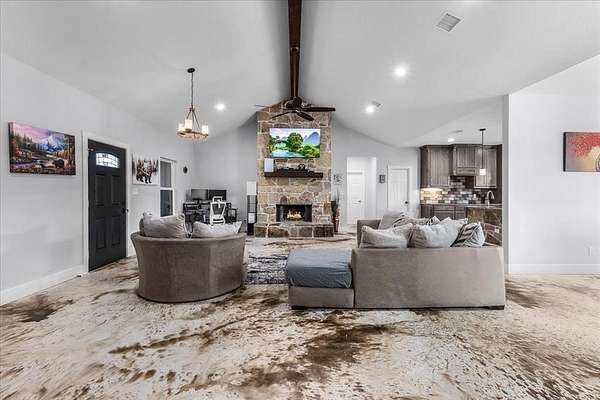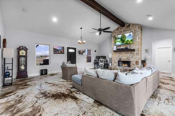 Discover this stunning acre+ country charmer that blends rustic elegance with modern upgrades, all just minutes from town! Step inside to an open-concept layout with split-bedroom design for ultimate privacy. The moment you enter, you'll be drawn to the soaring floor-to-ceiling stone fireplace that anchors the spacious living room. Gorgeous stained concrete floors flow throughout the house, leading seamlessly into the chef's kitchen featuring granite countertops, breakfast bar, stainless steel appliances, and a huge walk-in pantry. Retreat to the oversized primary suite complete with dual vanities, relaxing garden tub, separate walk-in shower, and an enormous walk-in closet. Three secondary bedrooms share a well-appointed full bath. The large utility room offers a utility sink plus extra space for a freezer or additional storage. Out back, the covered patio overlooks your private backyard oasis with above-ground pool, perfect for summer barbecues and evening relaxation on your quiet 1+ acre lot. Energy-efficient solar panels will be PAID IN FULL by seller and convey at closing, hello lower electric bills! Move-in ready and QUALIFIES FOR USDA 0% DOWN FINANCING!