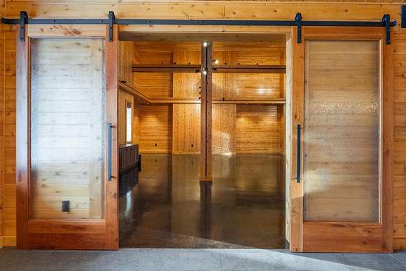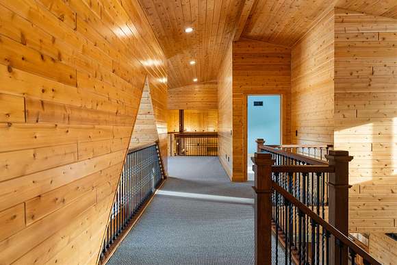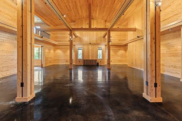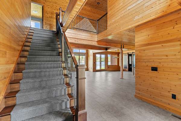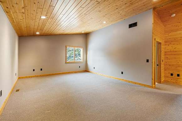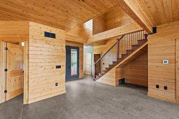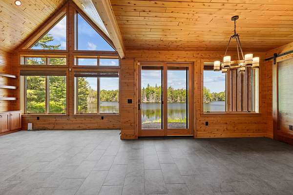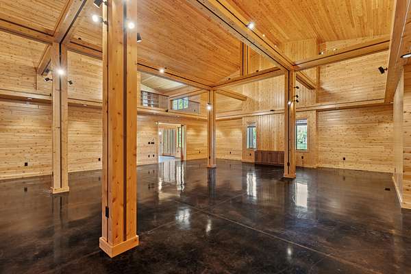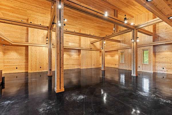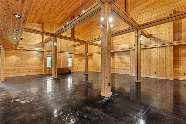 The trophy room that was custom designed by the owners for future window or door walls on either end makes for unlimited possibilities for this beautiful white cedar showroom.