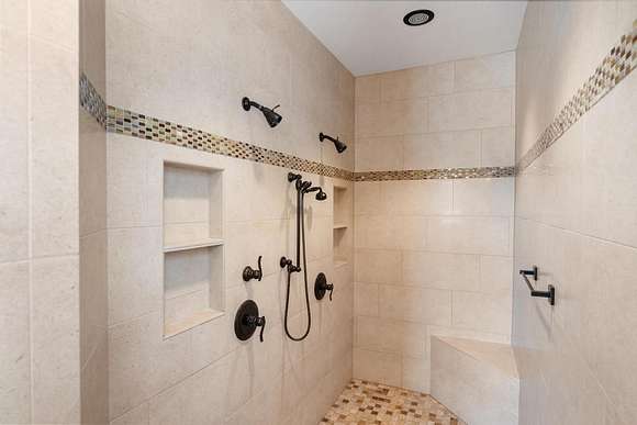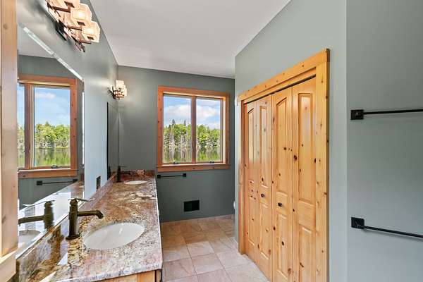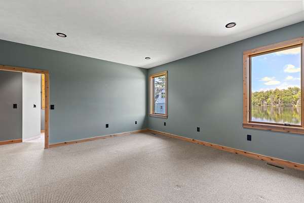 The large primary bedroom suite is conveniently located on the main level and takes full advantage of the lake views. The bath has a double sink and a 2 person shower that offers a lake view. The walk-in closet compliments the suite.