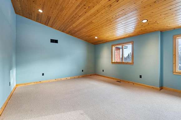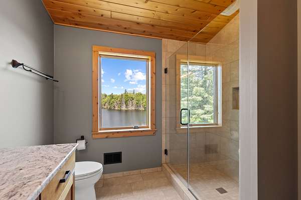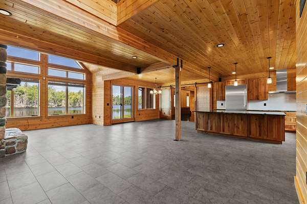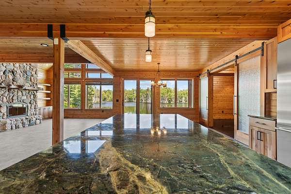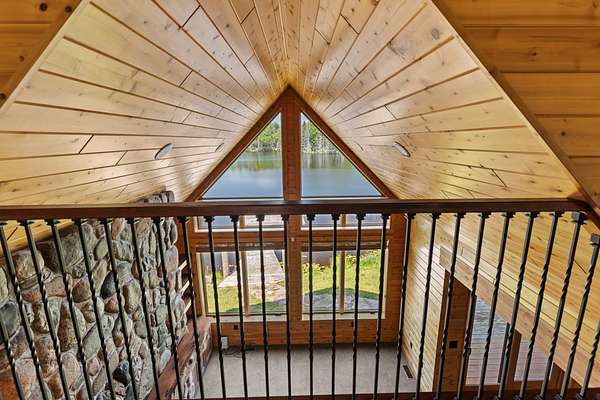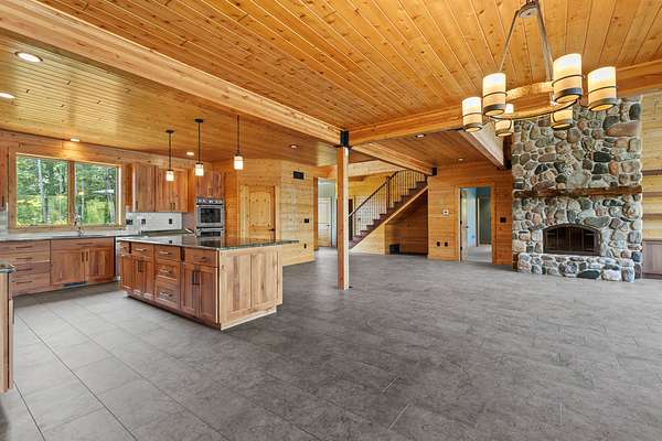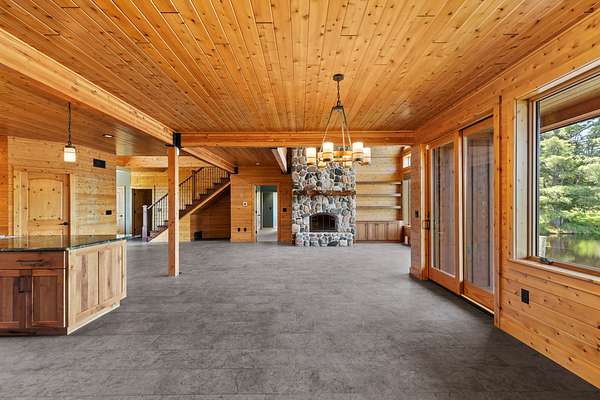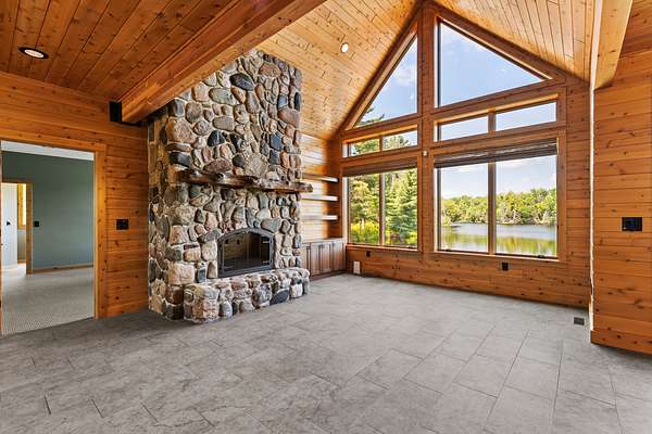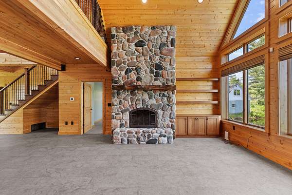 The great room features a gorgeous stone fireplace that was constructed from Lake Superior stones that were carefully handpicked by the owners. This comfortable living area of the home has vaulted ceilings and well appointed windows to enjoy the lake and wildlife views.