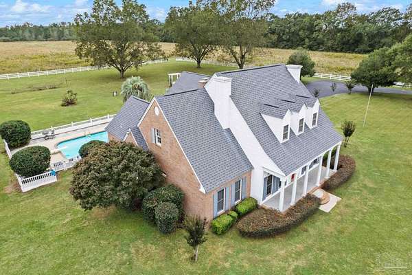 Elegant Brick Estate with Pool, Barn & 31.1+/- Acres - Experience refined Southern living on peaceful acreage just minutes from town. This timeless two-story brick estate offers generous living space indoors and out, featuring 5 bedrooms, 3 full baths, and a half bath conveniently located near the carport and the impressive 33,000-gallon in-ground pool. Quality upgrades bring comfort and confidence, including a new roof (2020), whole-house PEX plumbing with mana-block system, luxury vinyl tile flooring with lifetime warranty, and a 17-kW standby generator with separate 250-gallon propane tank. The main level includes 3 bedrooms, 2 full baths, a half bath, and inviting living spaces. A wood-burning fireplace with gas-log option anchors the family room. The kitchen features granite countertops, a walk-in pantry, and a bright breakfast area, complemented by a formal dining room. A spacious laundry room adds excellent functionality and storage. The primary suite offers double vanities, jetted tub, double closets, and patio access overlooking the pool. Upstairs are 2 additional bedrooms, a full bath with walk-in closet, and a flexible den ideal for media, play, or office use. Outside, the estate continues to impress. White vinyl fencing encloses approximately 5+/- acres around the residence, creating a polished park-like setting. The remaining acreage is suitable for farming, pasture, horses, or livestock, offering true versatility. Enjoy fig, plum, blueberry, scuppernong, and Elliott pecan trees throughout the property. A 30'*40' metal barn with underground power, water, and its own meter provides valuable workspace and storage. Properties combining meaningful acreage, privacy, and convenience are increasingly rare. For those seeking space, comfort, and a distinguished rural setting, this home delivers. Call now to schedule a showing!