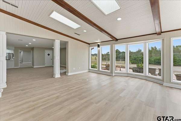 Nestled on a sprawling 78-acre estate, this newly remodeled home exudes both charm and modern sophistication. From the moment you step inside, the fresh, crisp scent of new paint welcomes you into an open and airy space designed for both comfort and style. The entire home has been thoughtfully updated, with newly installed hardwood floors that gleam under the soft, natural light pouring through oversized windows. The sleek, modern finishes blend seamlessly with the home's original character, creating a perfect balance of old-world charm and contemporary convenience. The heart of the home is its spacious, state-of-the-art kitchen, complete with brand-new, high-end appliances. Whether you're preparing a casual meal or hosting a dinner party, this kitchen is as functional as it is beautiful, with ample counter space and custom cabinetry that offers both elegance and practicality. The living and dining areas are expansive and open, ideal for family gatherings or simply relaxing. A sparkling pool, serves as the perfect backdrop for outdoor relaxation and entertaining. The pool house provides additional space for guest or a quiet retreat, with its own bathroom and kitchenette. Beyond the pool, the property extends into rolling hills, offering breathtaking views and a sense of tranquility. The land includes a horse barn, complete with cattle working pens and well-maintained pipe fences. Whether you're an equestrian enthusiast or have dreams of a hobby farm, this property has everything you need to make those dreams a reality. A small lake adds to the scenic beauty, while a spring-fed creek flows year-round, enhancing the sense of peace and natural beauty. This property is conveniently located just six miles from historic, Sulphur Springs. There, you'll find a charming downtown square, brimming with boutiques, shops, and some of the best local dining in the area. This home isn't just a place, it's a lifestyle, combining modern luxury with country living.