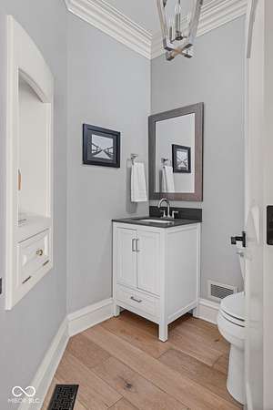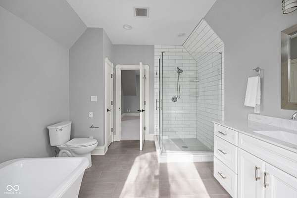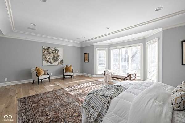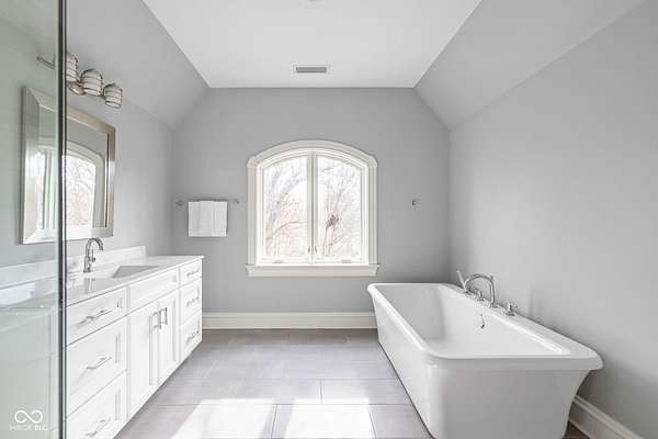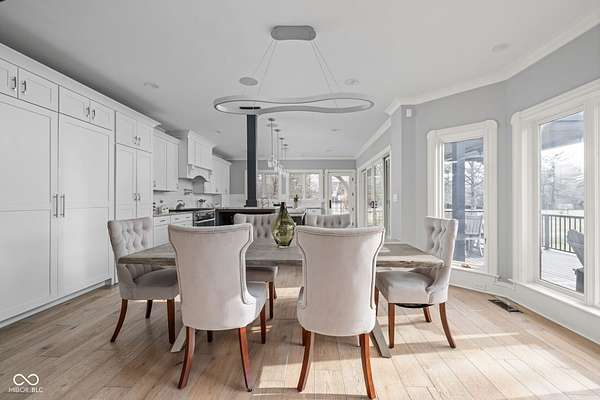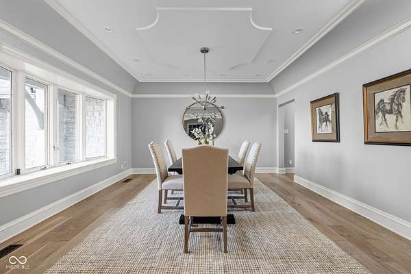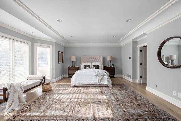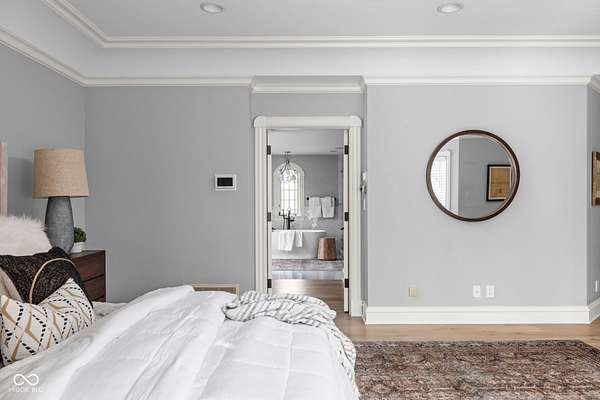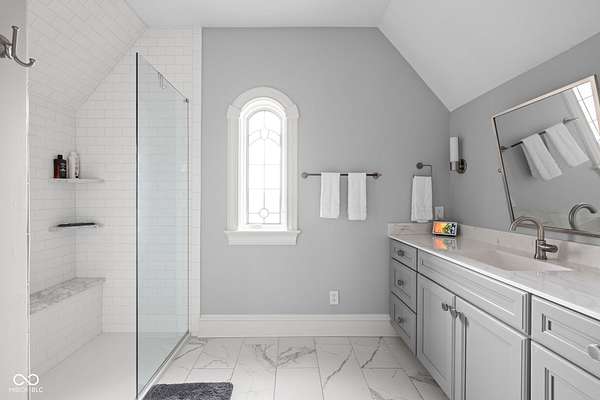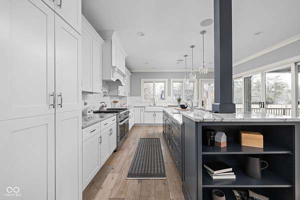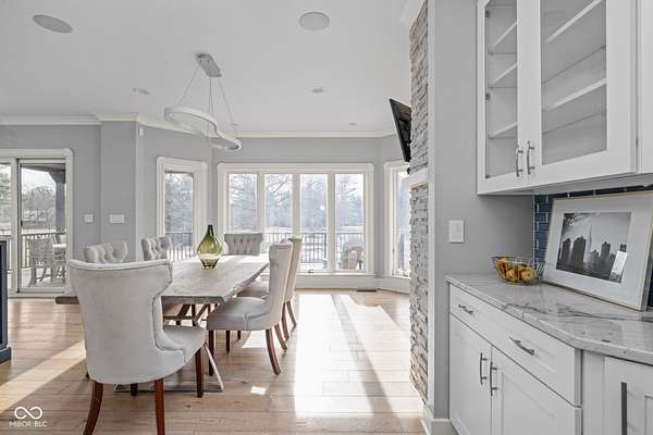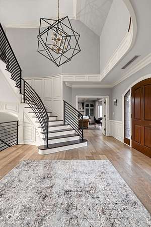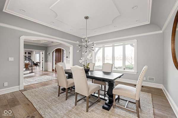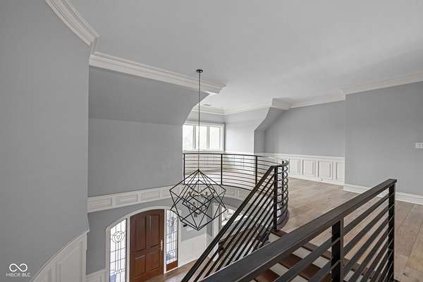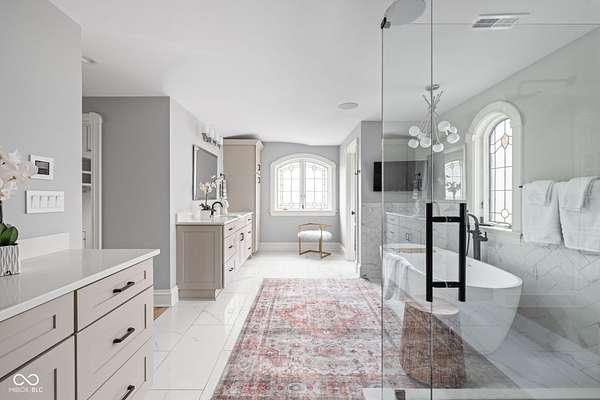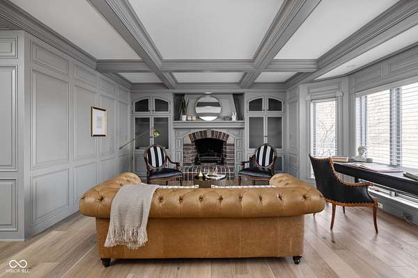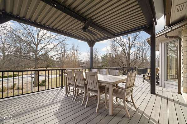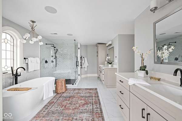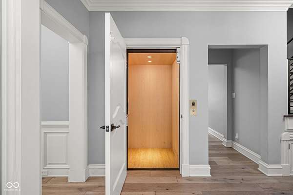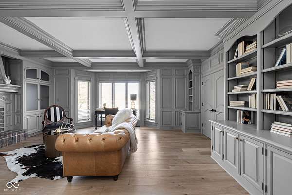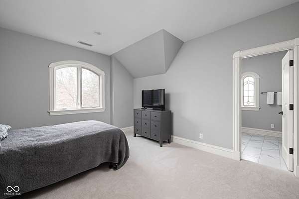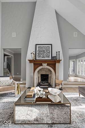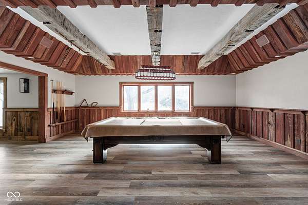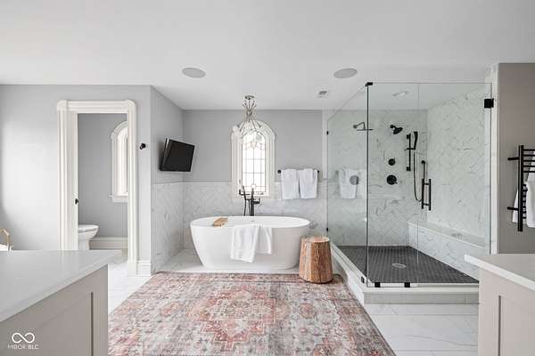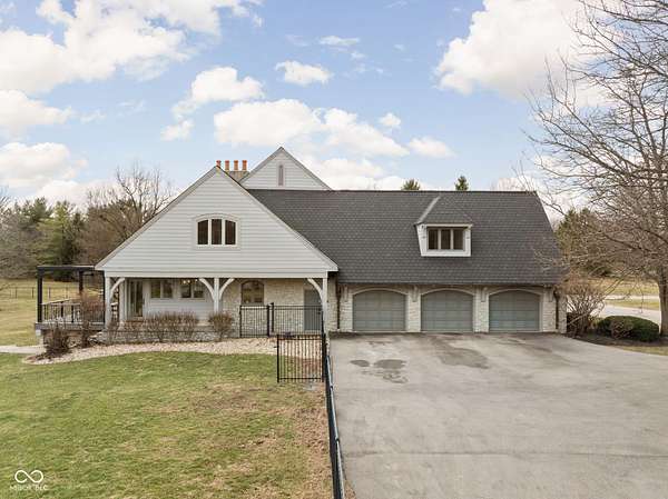 Exceptional 5-acre estate in the heart of West Carmel featuring a beautifully updated residence, six garage bays, and a separate carriage house with a fully operating private apartment. The main level and baths were renovated in 2018. A richly appointed office with fireplace and custom wood built-ins anchors the main floor, alongside a generous primary suite with a beautifully updated bath and dual walk-in closets. The home offers six bedrooms plus a loft, spacious ensuite upper bedrooms with updated baths, a cedar closet, an elevator serving all three floors, and four gas fireplaces. The chef's kitchen is a standout with heated floors, premium Miele appliances, and a concealed walk-in pantry. A rare highlight is the carriage house, which includes three garage bays and a private apartment complete with full kitchen, bedroom, and bath-ideal for parents, adult children, guests, or an au pair seeking privacy and independence. Three additional bays are attached to the main home for exceptional storage and flexibility. The walk-out lower level is designed for entertaining and functionality, featuring a second kitchen, fitness area, and a huge workshop, along with a covered patio perfect for watching TV and relaxing outdoors. Step directly out to the patio and private saltwater pool area. Outdoor living is equally impressive, with a veranda stretching the length of the main floor, including pergola-covered dining just off the kitchen. Additional features include Trex decking with an automated pergola, stained-glass details, copper gutters, partially fenced acreage, and the convenience of city water and sewer.