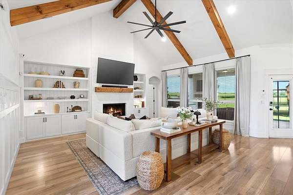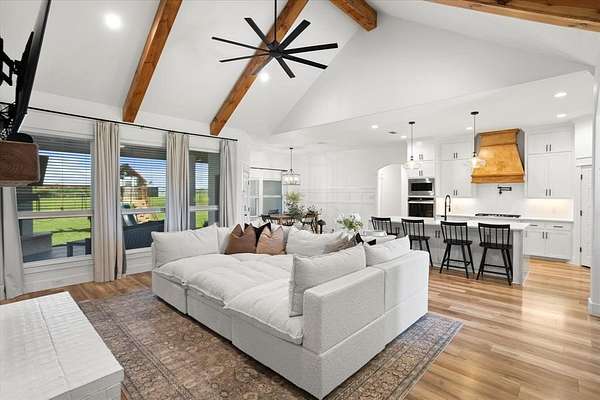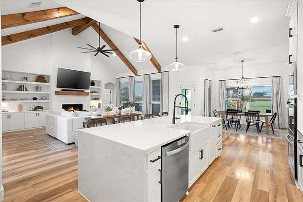 Welcome to 1074 Pioneer Crossing in beautiful Weatherford, Texas! This charming single-family residence offers an inviting blend of modern elegance and cozy comfort. As you enter, you'll be greeted by a spacious living area with stunning custom beams and accent walls that create a warm and inviting atmosphere. The heart of the home features a gourmet kitchen, complete with a quartz waterfall island, double ovens, and custom cabinetry--perfect for culinary enthusiasts.