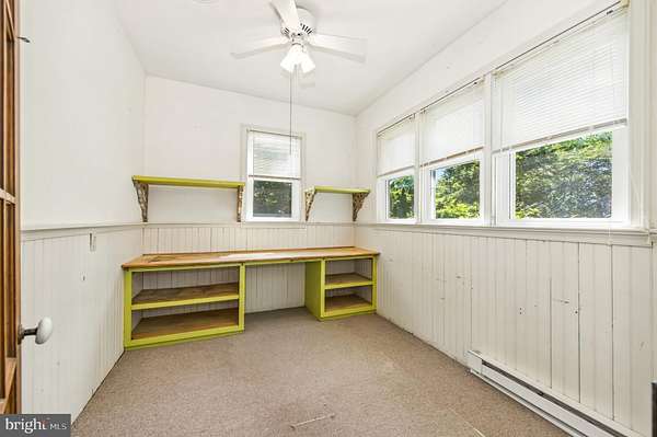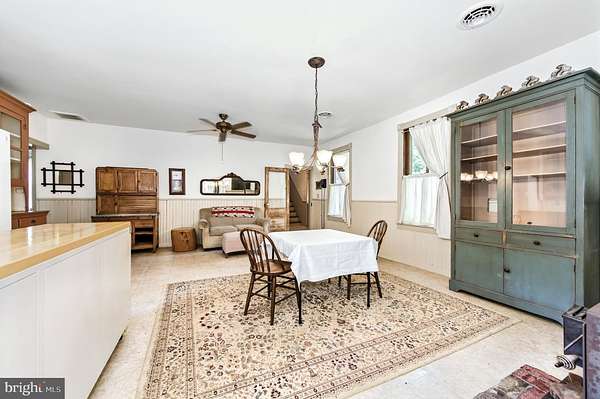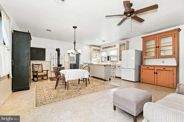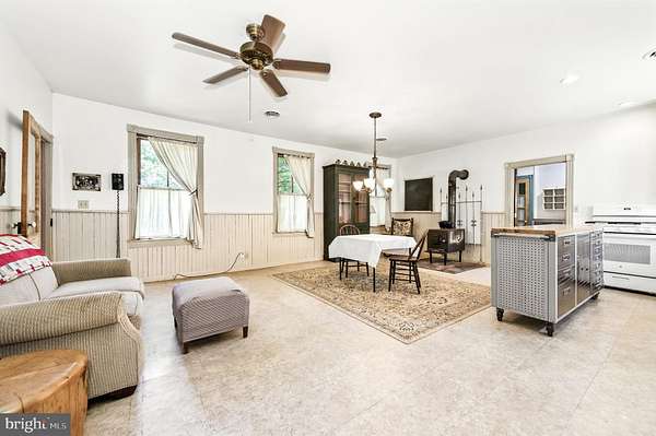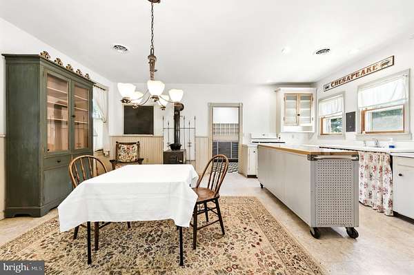 - Built-Ins, Carpet, Ceiling Fan(s), Country Kitchen, Eat-In Kitchen, Island Kitchen, Recessed Lighting, Wainscotting, Walk-In Shower Bathroom, Wood Floors, Wood Stove