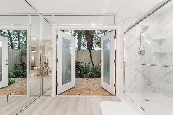 - Fencing, French Doors, Level, Lighting, Outdoor Grill, Outdoor Shower, Paved, Sidewalk