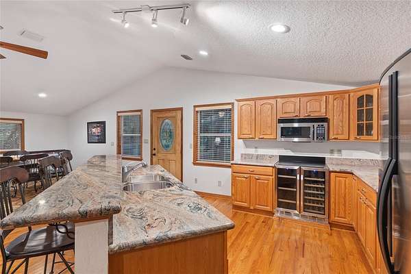 - Built-In Features, Cathedral Ceiling(s), Ceiling Fans(s), Dry Bar, Eat-In Kitchen, Kitchen/Family Room Combo, Primary Bedroom Main Floor, Solid Wood Cabinets, Split Bedroom, Stone Counters, Walk-In Closet(s), Window Treatments