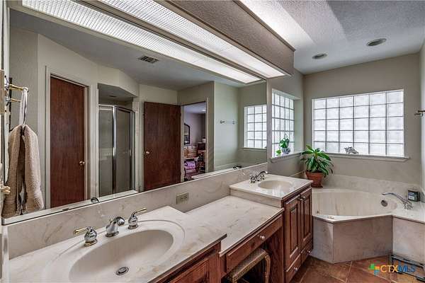 - Breakfast Bar, Built In Features, Ceiling Fans, Custom Cabinets, Dining Area, Double Vanity, Garden Tub Roman Tub, High Ceilings, His And Hers Closets, Kitchen Family Room Combo, Main Level Primary, Multiple Closets, Pantry, Primary Downstairs, Pull Down Attic Stairs, Separate Formal Dining Room, Separate Shower, Walk In Closets, Walk In Pantry