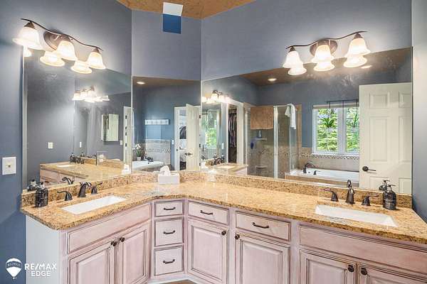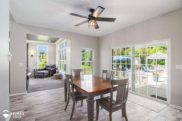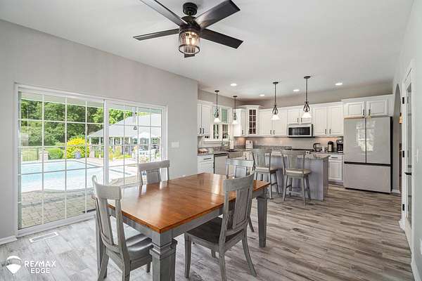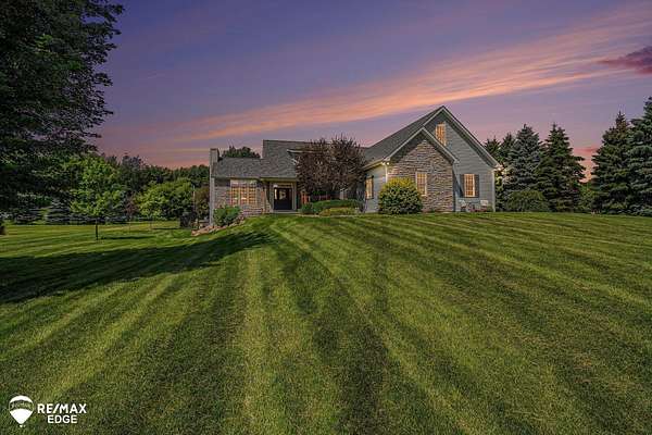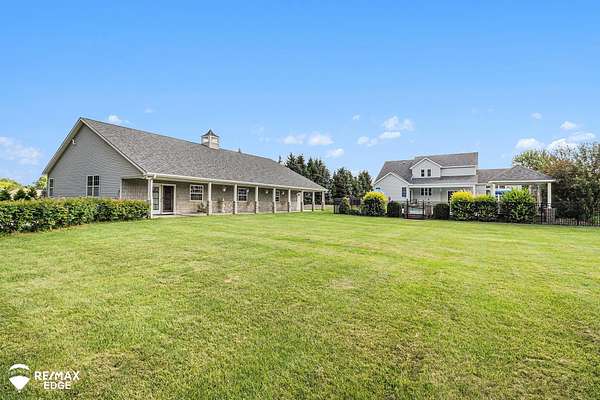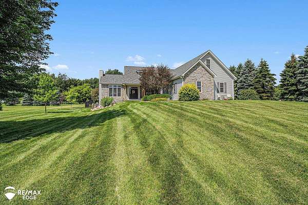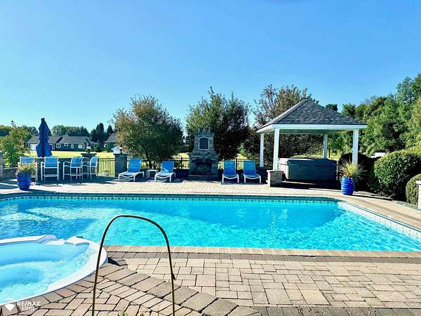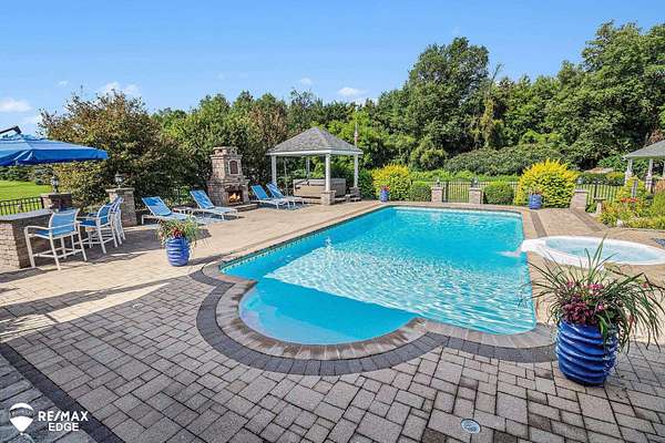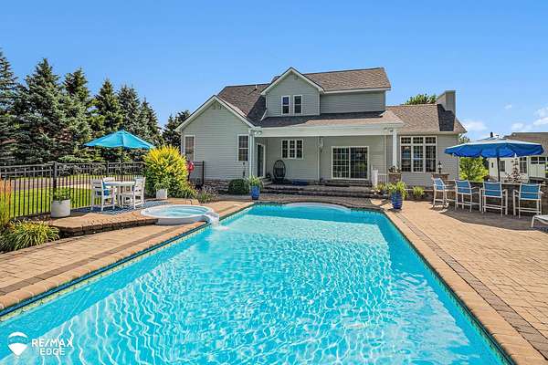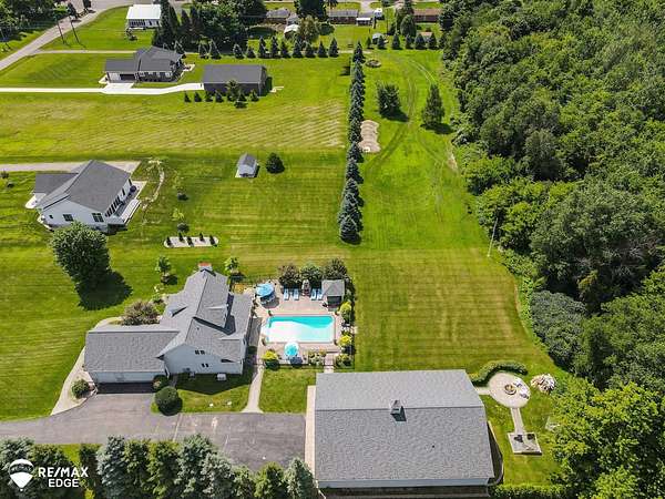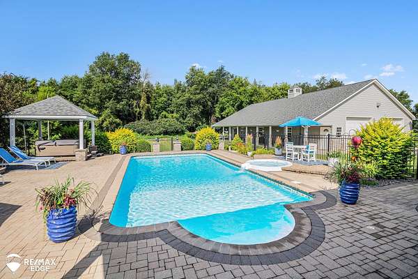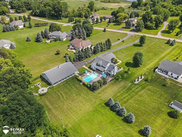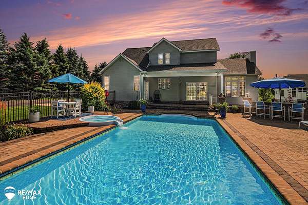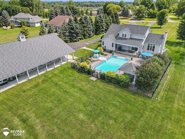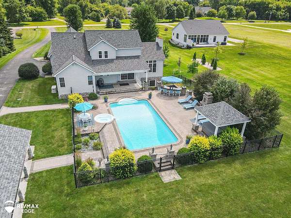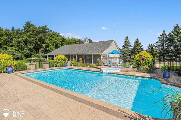 Resort-style living meets everyday comfort in this exceptional two-story estate on 3.44 acres, designed for relaxation, recreation, and versatility. At the heart of the property is your own private oasis--a 36x18 in-ground pool surrounded by an expansive 63x53 brick patio, complete with a built-in bar, outdoor fireplace, and a spill-in spa with jets and a cascading waterfall. Whether hosting summer parties or enjoying a quiet evening under the stars, this backyard is pure paradise. Car enthusiasts and hobbyists will love the 3 car attached heated garage, detached 40x48 garage that is insulated, infrared heat, equipped with hot/cold water, full electrical service, and a covered porch. The secondary driveway offers easy access for larger vehicles or equipment. For extended family or guests, the 40x22 guest house/in-law suite provides complete independence with a full kitchen, large snack bar, cozy living room with fireplace, bedroom, bath, furnace, and central air, porch & firepit. Inside the main home, you'll find a sun-filled great room with soaring ceilings and a custom fireplace, a gourmet island kitchen with granite countertops and high-end appliances, and a main-floor primary suite with direct pool access, ceramic tile bath, and a walk-in closet. Upstairs offers Jack & Jill bedrooms and bath, plus a bonus room ready for finishing. The lower level walkout features a patio, daylight windows, full bath and would be easy to finish for additional living space. 22kW Generac generator runs everything in a power outage. This property has it all!