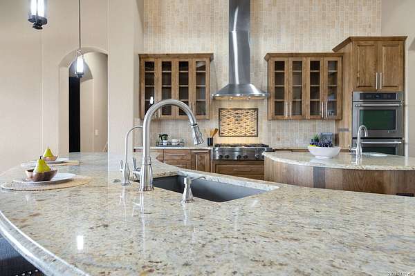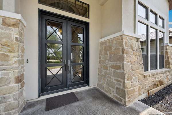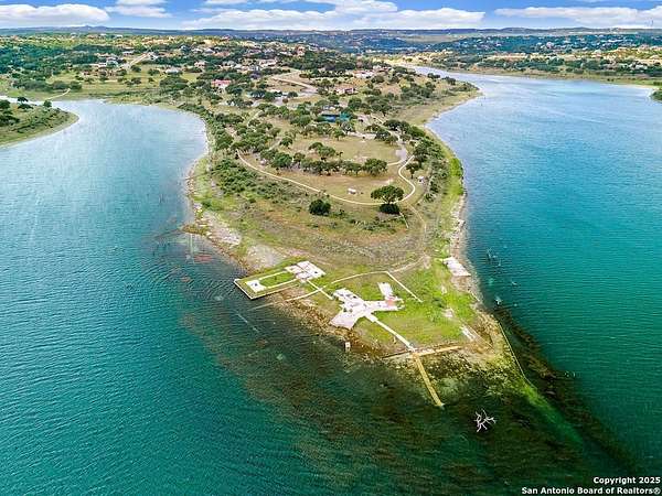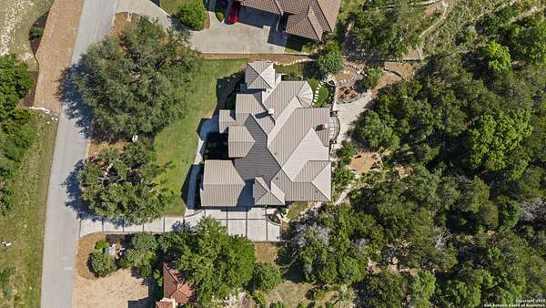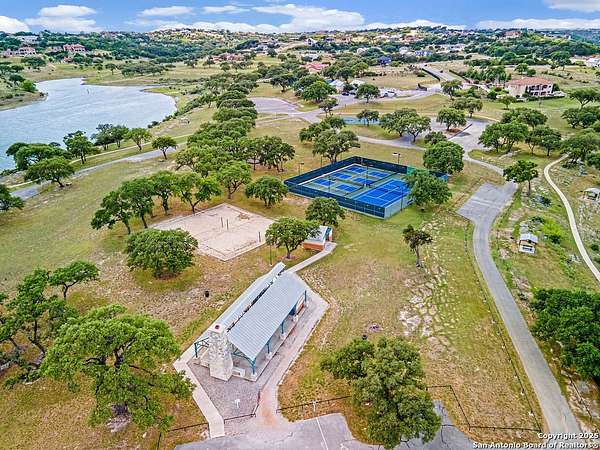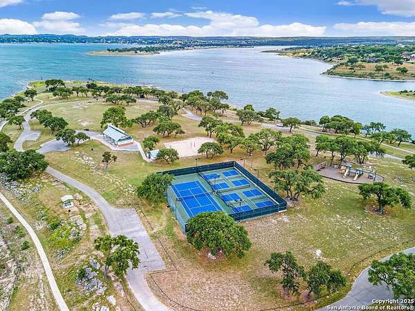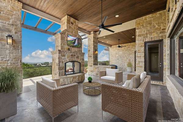Welcome to 1078 Star Ridge, an exceptional custom-built home located in the highly desirable Mystic Shores community of Spring Branch, TX. Perched on 1.76 acres with mature oak trees and panoramic views of Canyon Lake and the Texas Hill Country. This stunning property offers luxury, privacy, and tranquility in one of the area's most prestigious neighborhoods. The 4,297 sq ft residence features 3 bedrooms, 3.5 bathrooms, a dedicated media/game room with a full wet bar and wine fridge, and an upstairs sitting area with a private balcony to take in the incredible views. From the moment you enter the gorgeous double metal doors, you'll be captivated by the home's elegant details, including a lighted barrel ceiling with faux finish in the entryway, soaring wood-beamed ceilings, and expansive windows that flood the space with natural light. The open-concept floor plan seamlessly connects the living, kitchen, and breakfast areas, while a separate dining room adds a touch of formality. The living room features a wood-burning fireplace and motorized shades for comfort and convenience. The gourmet kitchen includes a large curved granite island, propane cooktop, double ovens, warming drawer, microwave drawer, chef sink, reverse osmosis system, and built-in desk. A butler's pantry with a wine fridge and additional cabinetry complements the walk-in pantry, offering abundant storage and prep space. The luxurious primary suite offers sweeping Hill Country views and a relaxing sitting area. Its spa-like bathroom includes a walk-through tiled shower, soaking tub beneath a dome ceiling, separate vanities with travertine finishes, and a coffee bar. The spacious walk-in closet features built-in drawers and shelving. Upstairs, two additional bedrooms each include their own full bathroom, along with a sitting area and a balcony that captures the beauty of the surrounding landscape. Step outside to enjoy the expansive covered patio, complete with a wood-burning fireplace and a full outdoor kitchen equipped with a grill, sink, and refrigerator-perfect for entertaining or relaxing while enjoying the view. The backyard is beautifully tiered with a fenced grass area for pets, a mid-level firepit, and a lower tier with a peaceful water fountain. Additional features include an oversized 3-car garage with epoxy floors, built-in storage, and space for an ATV. Located in the premier Mystic Shores subdivision, residents enjoy access to unmatched community amenities including a boat ramp, two swimming pools, lakeside parks with picnic and grilling areas, a community center, tennis and pickleball courts, basketball and volleyball courts, secure boat/RV storage, and a 200+ acre nature preserve. This is Hill Country living at its finest-private, peaceful, and full of luxury. Don't miss your opportunity to own this breathtaking Canyon Lake view property.
