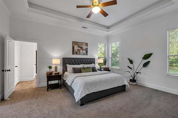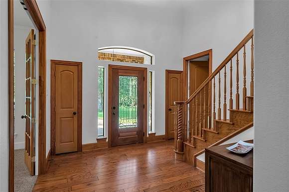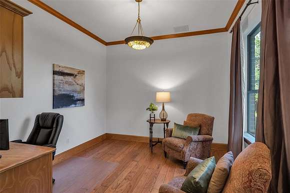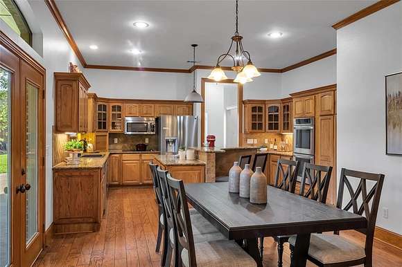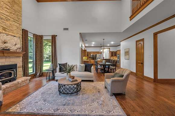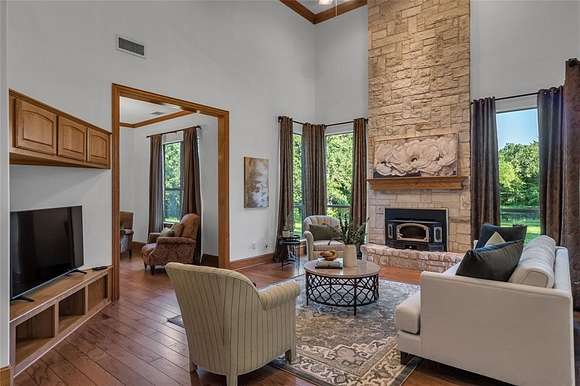 NEW PRICE! Entering the gate, the exquisite custom built home on 56 sprawling acres emerges in a clearing through the trees. Boasting 5 spacious bedrooms with 2 downstairs, the home includes 5 bathrooms with 3 full and 2 half baths. The downstairs primary ensuite includes a luxurious bath and an additional room for an office or exercise room. A two story stone wood burning fireplace is the home's focal point anchoring the spacious living room. The thoughtful layout showcases an open concept which stretches from the living room, across the dining area and encompasses the kitchen with its custom cabinets and bar seating. For added entertainment, the downstairs includes a media room. Ascending to the upper level, you'll find 3 additional bedrooms and 2 full baths. There is an unfinished 273sft bonus room with a second staircase accessible through a separate exterior entrance that could be completed to suit your needs. The large tranquil pond behind the house is visible from most every room. The wooded 56 acres includes riding trails ready to be explored. The property gently falls to the Briar Creek which serves as the boundary for the back of the property stretching over one third of a mile along its banks. The home includes a 40x50 shop with lined with shelving and a covered RV pad. The luxury property is in Wildlife Management.