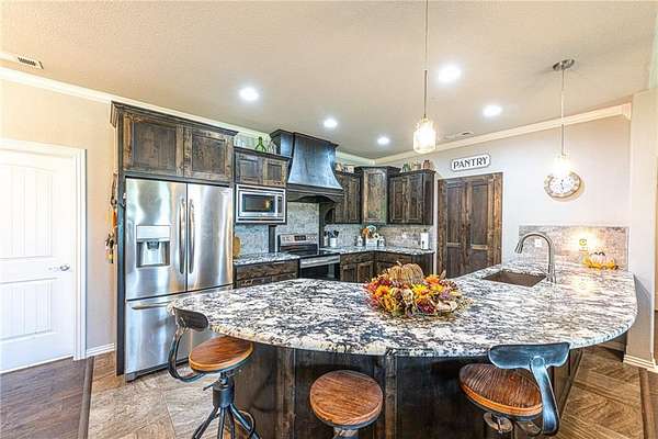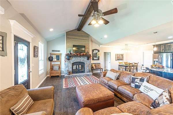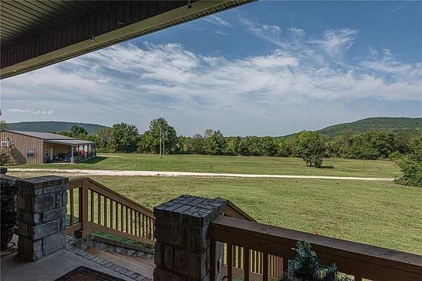 Welcome home! Brick & stone 3 bd, 2 bath home w/ 1,940 sq ft, built in 2017, situated on 12.91+- AC. Located <8 miles from the University of Arkansas, downtown Fayetteville, Prairie Grove, & Farmington. Covered front porch spans width w/ mountain & countryside views. Open concept living w/ vaulted ceiling, wood flooring & statement FP w/ stone, brick & wood accents. Kitchen offers stained cabinetry, tile backsplash, granite counters, stainless steel appliances, walk-in pantry, & curved counter-height peninsula. Primary suite feat: 2-way fireplace, private patio access, & ensuite w/ dual sink vanity, tiled dual-head shower, & walk-in closet connecting to laundry w/ utility sink. Two add'l bedrms & full bath! Exterior amenities: 30x30 shop w/ elec + attached 600 sqft 1 bdrm/1 bath apt w/ kitchen & living. 2 septic systems (main home & apt), RV pad w/ 50-amp plug, water supply, & dump station. Existing pecan trees & mostly cleared acreage w/ creek provide options for hobby farm or recreation. Don't miss out! Act now!