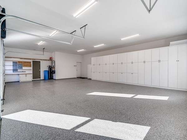 The open floor plan includes an eat-in kitchen & living room anchored by a large stone gas fireplace. The kitchen features a gas range with hood, refrigerator, dishwasher, wall oven, microwave, and an ice maker. The laundry room includes a washer, dryer, and a full-size refrigerator. A bonus family room offers flexible use as a sunroom, game room, workout room, playroom, or craft room, complete with cabinetry and a sink. An oversized epoxy-coated 3-car garage includes an additional 500 sq ft of built-in storage cabinets. The covered back patio has a built-in gas grill and a sink.