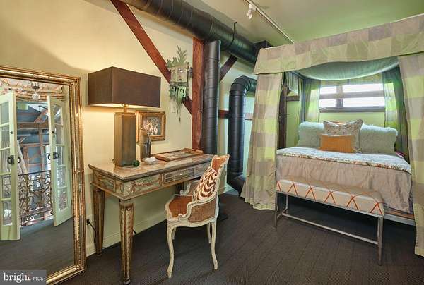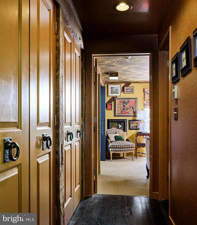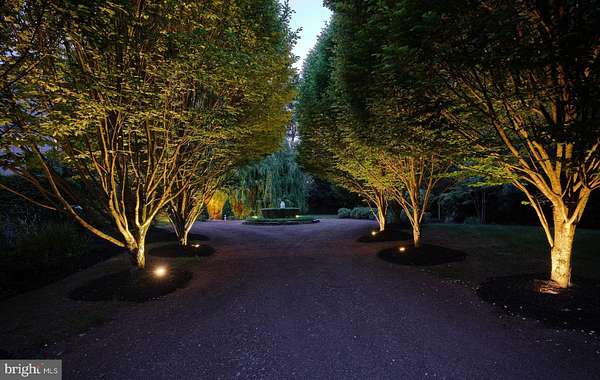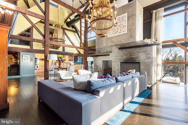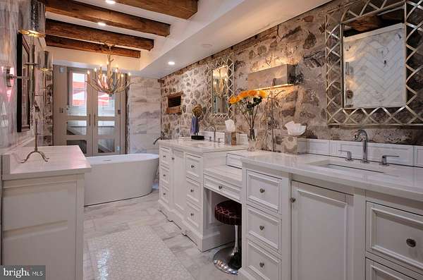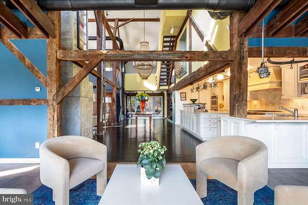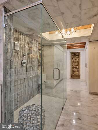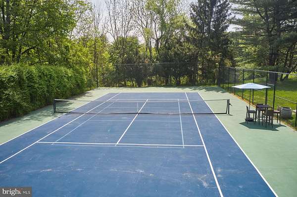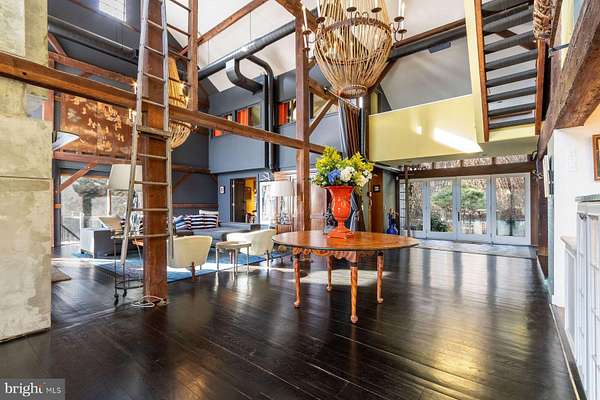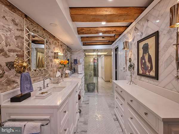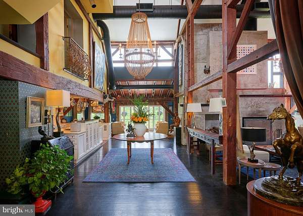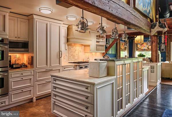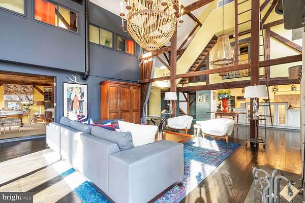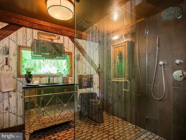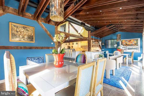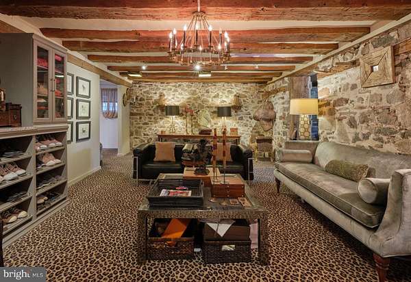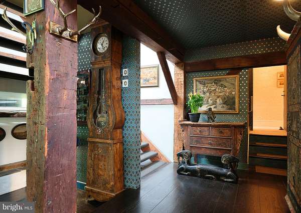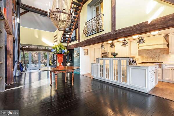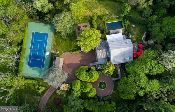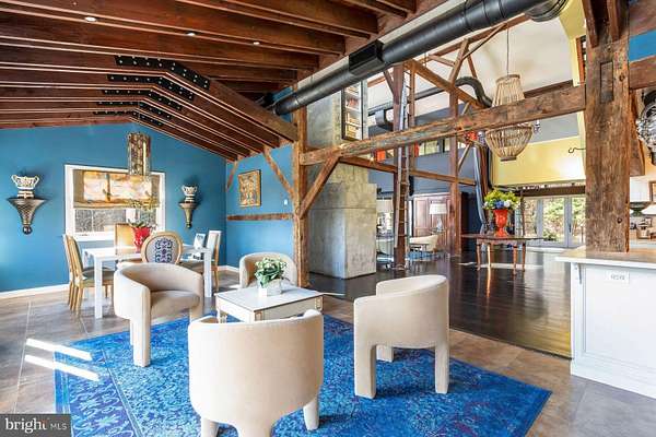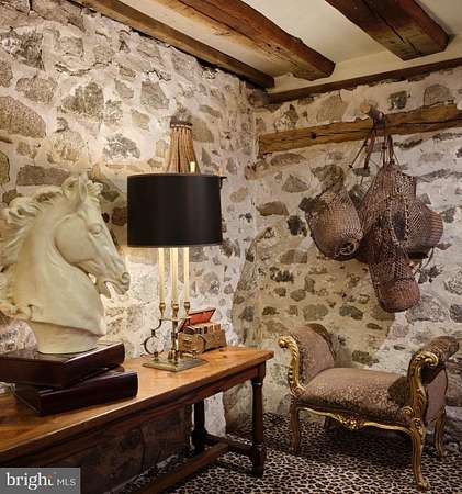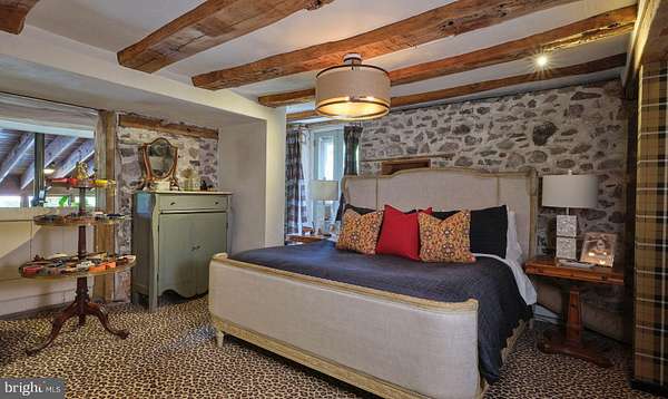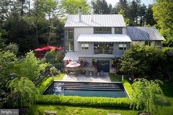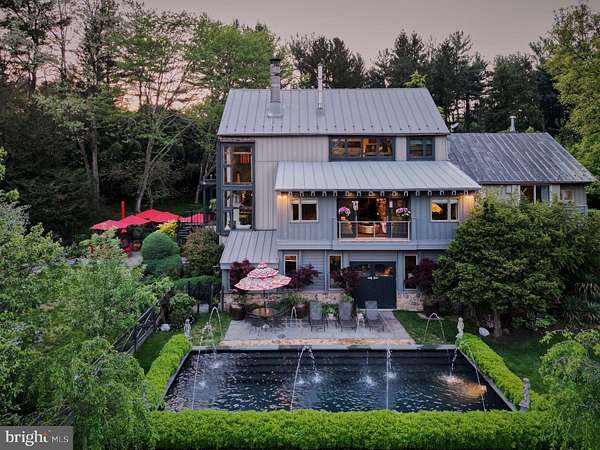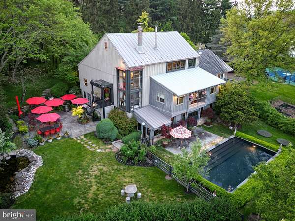 This stunning barn conversion seamlessly blends rustic charm with modern luxury. The barn and farmhouse date back to 1710. The character of the original barn has been carefully preserved featuring the original exposed beams and magnificent stonework. Upon entering the home, you are greeted by a spacious open and flexible living area with soaring ceilings and large windows that flood the space with natural light. There are also radiant heated hard wood floors throughout this level. This designer decorated home is available fully furnished. A beautiful bright gourmet kitchen boasts high end appliances, a large center island and lots of counter space and custom cabinetry. The living room is spectacular with a magnificent Rumsford fireplace at its center. There is also a large dining area surrounded by windows overlooking the gardens. This floor also has a well-sized office and a full bath. The stone walls, wood beams and radiant heated floors continue to the lower level featuring an amazing primary suite which includes a large bedroom, gorgeous marble bathroom with mother of pearl mosaic floors, glass shower and soaking tub. A dressing hall features rows of closets and there is a sitting/dressing room with beautiful lit cabinetry. A balcony works perfectly as a home gym overlooking a sunroom and double doors out to the pool and gardens. The second floor includes 2 guest suites and a full bath. The third floor has an interesting, cozy space for either an additional bedroom or home office. The home also includes a completely private one-bedroom guest apartment with a full kitchen, living room and deck overlooking the gardens. The apartment is accessible from either inside the home or through its own private entrance with an elevator. Step outside to discover the extensive lush gardens and mature trees, creating a peaceful escape. The expansive Blue Stone terrace with outdoor kitchen is ideal for seasonal al fresco dining while overlooking the swimming pool complete with eight fountain heads. There is also a koi pond with waterfall and magnificent illuminated gardens. A tennis/pickle ball court completes the outdoor amenities. The home is conveniently located with a wide variety of shopping and dining options minutes away. Drive time to Princeton is 20 minutes, 40 minutes to Philadelphia and 70 minutes to NYC while the nearest train station is a 20-minute drive. Behind the gated entrance, Eight Bells is truly a private oasis located in one of Bucks County's most prestigious/upscale towns. A perfect getaway retreat, this property promises a lifestyle of elegance and tranquility.