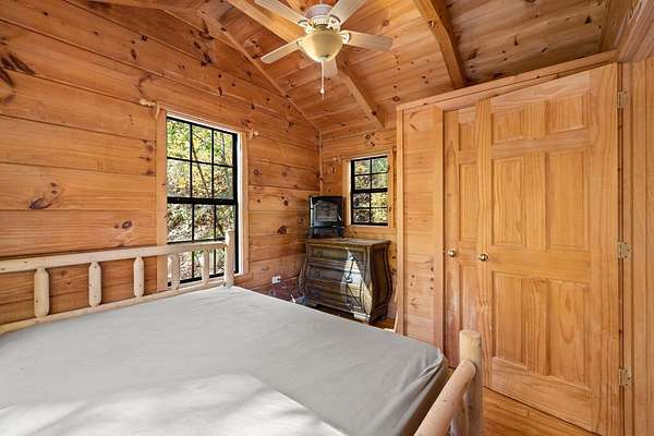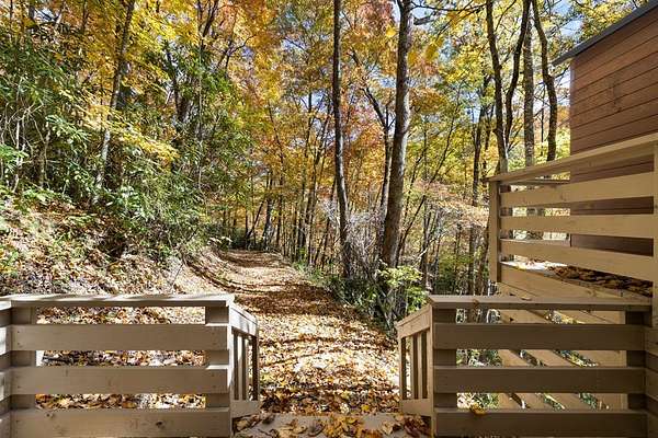Whittier exit 72, past post office to Old Bryson City Rd. Turn on Conleys Creek drive 3.7 miles to right on Chestnut Cove. Travel 1.1 miles to right on Waterfall Hollow. Turn right just past bridge at LO pointer/green gate. Enter and head straight up the hill to the end. You will pass the small cain #2 on right, park at Cabin #1 just beyond this