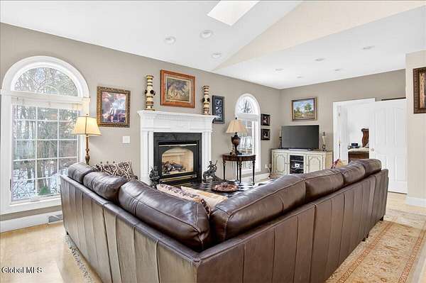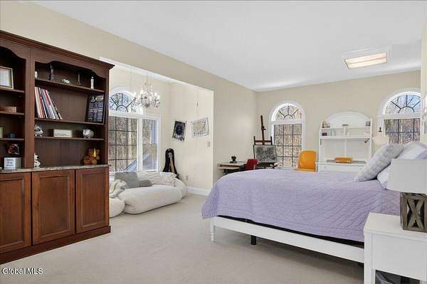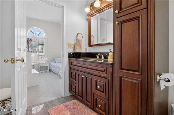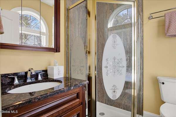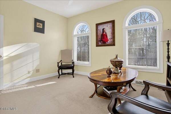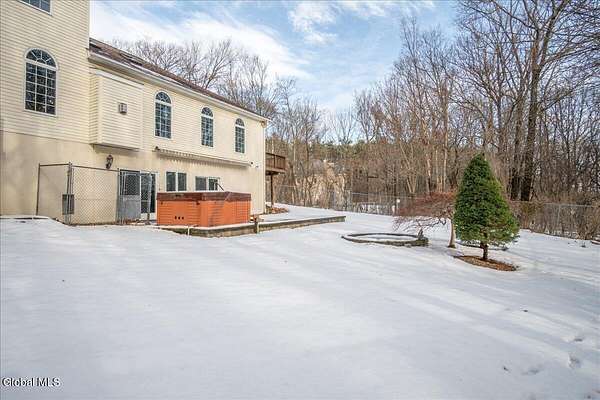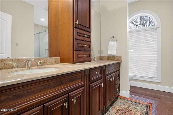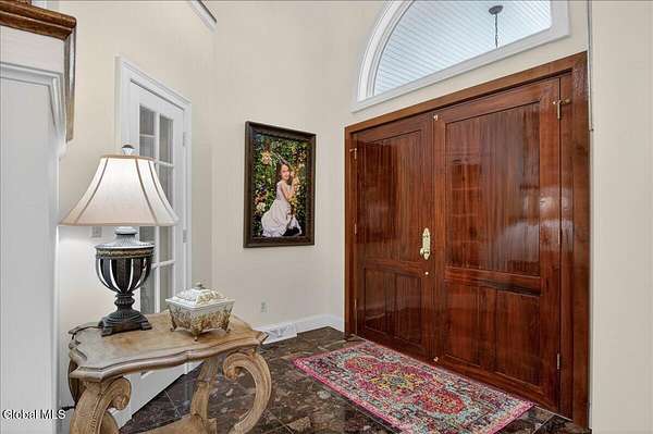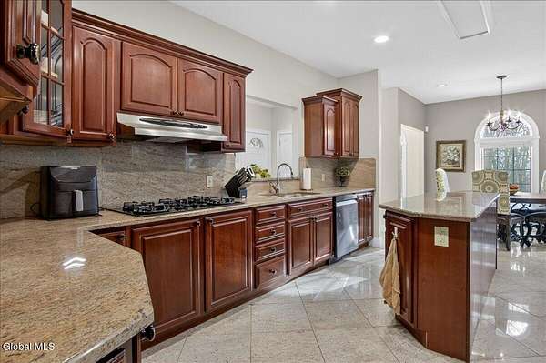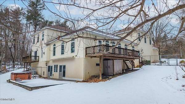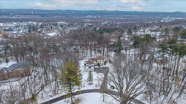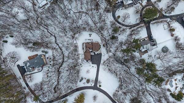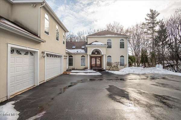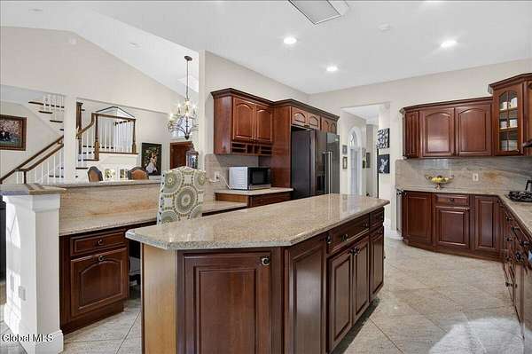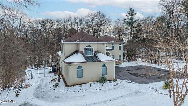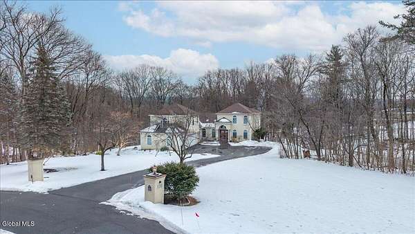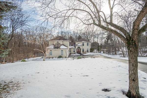 Unique and stunning custom home, quietly tucked away on picturesque Woods Lane and beautifully situated on 2.2 private acres. Double solid carved wood front doors create an impressive and welcoming entrance to this exceptional residence. The home offers gracious living spaces and outstanding flexibility, including a fully finished walk-out basement featuring a second kitchen, full bath, exercise studio, and convenient stair access to the garage-ideal for extended living, guests, or entertaining. The main level boasts a desirable first-floor primary bedroom with an updated en-suite bath, as well as an additional first-floor bedroom and full bath. The handsome kitchen features a large center island and opens seamlessly to a sun-bathed sunroom, creating a warm and inviting gathering space. Upstairs, you'll find two bedrooms connected by a Jack-and-Jill bathroom, a loft area, and an additional expansive bedroom with a full bath located over the garage-perfect for guests or a private retreat. Recent updates provide peace of mind and modern efficiency, including a new roof (2022), new furnaces and air conditioning units (2022 & 2023), a whole-house generator (2022), two tankless water heaters, and a newly renovated primary bath shower and a 3 car garage. The home is further enhanced with four outdoor security cameras installed in 2023. An awning over the newly restored side deck adds comfort and functionality to the outdoor living space. A rare offering that combines privacy, thoughtful design, and extensive upgrades-this home is truly one of a kind. **Exclude chandelier in 2nd flr bedroom.