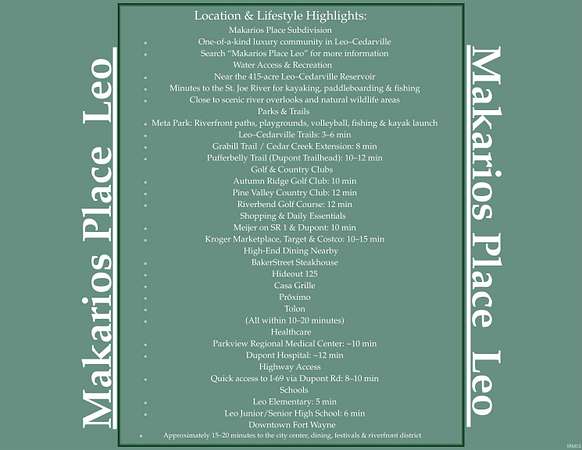 LOT #23 In Makarios Place: Build your customized, dream home with Star Homes on this builder exclusive lot. Welcome to this stunning 0.44-acre pond lot in the desirable Makarios Place subdivision. Nestled in a scenic, tree-lined setting, this property offers a blend of peaceful, woodsy living with convenient access to modern amenities within a short commute to Fort Wayne. Located near the Saint Joseph River and Riverside Garden Park in Leo. The subdivision features a pickleball court, pond views, and walking trails offering opportunities for outdoor recreation. Located in East Allen School District/Leo Schools. Makarios Place lots have city sewer, city water and electricity available. Floor Plan provided is only for inspiration only. This lot is vacant and waiting for you perfect custom home!