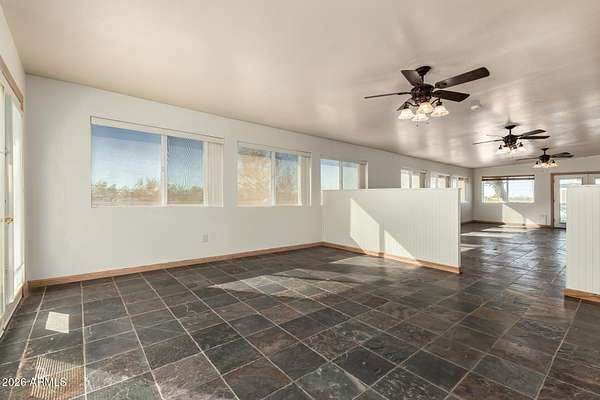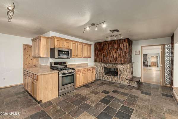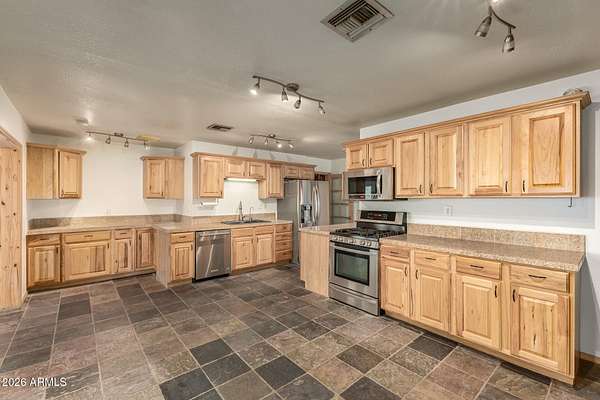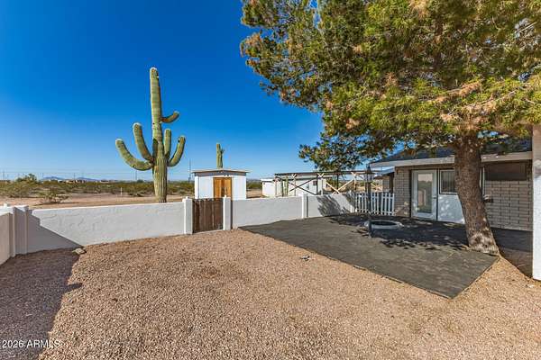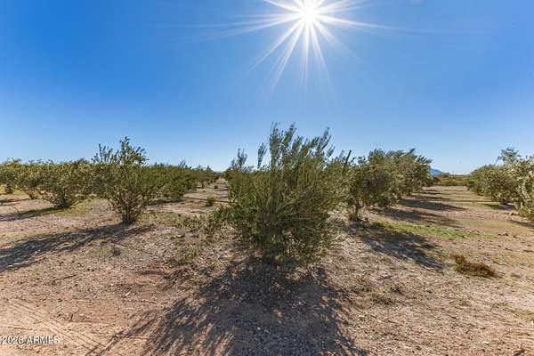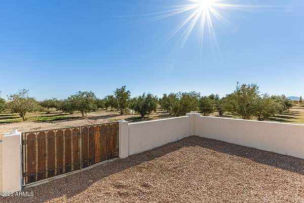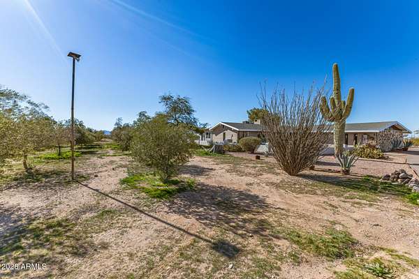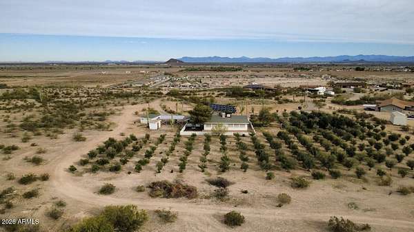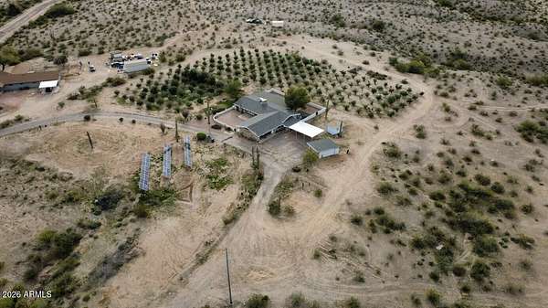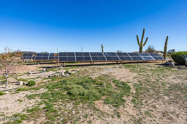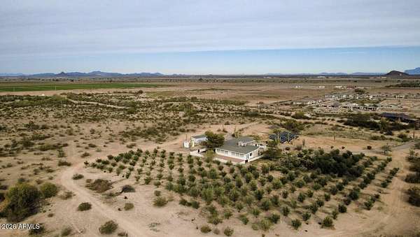 This one-of-a-kind property sits on 5 acres with no HOA, offering a rare combination of usable land, established olive trees, and long-term energy efficiency. The mature fruiting olive trees add character and thrive with minimal water, though generously maintained. The home features 2,500 sq ft, with 3 bedrooms, 2 baths, large laundry which can double as a mud room or office, and an open floor plan showcasing slate tile flooring and abundant natural light. The chef's kitchen includes granite countertops, stainless steel appliances, gas cooktop, plentiful cabinet space, and a walk-in pantry. The back patio includes a fireplace and stunning desert views. Recent upgrades include a 19+ kW PV solar system for reduced energy costs, Cox internet line supporting up to 2Gbps, Tesla EV charger, RV outlet, and a reverse-osmosis system kitchen, water softener in the garage and updated LED lighting throughout. The fully paved driveway ensures easy access without mud during rain, and the property includes RV parking. Parking includes a 2 car garage and 3 car carport, a total of 5 covered spaces, and 10 slab parking spaces. This exceptional property combines privacy, functionality, and modern upgrades, making it a rare find on a spacious 5 acres 1 mile from downtown Florence.