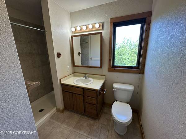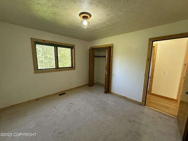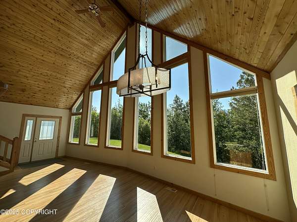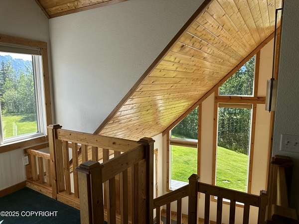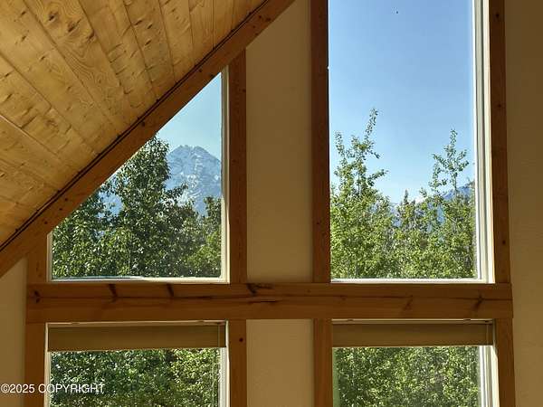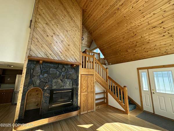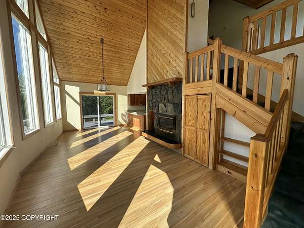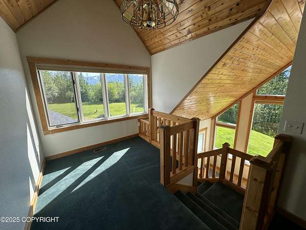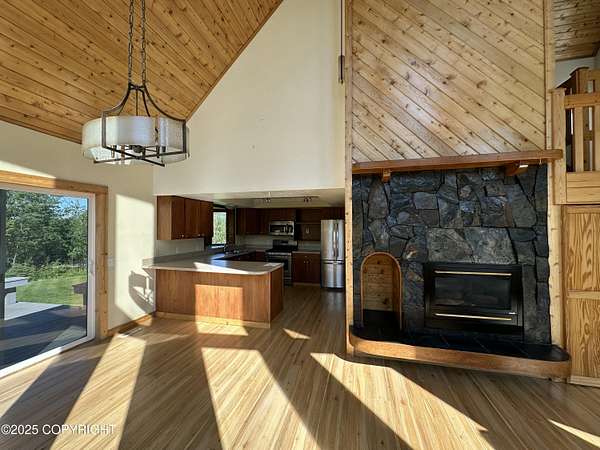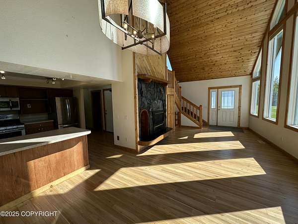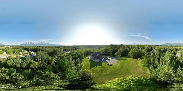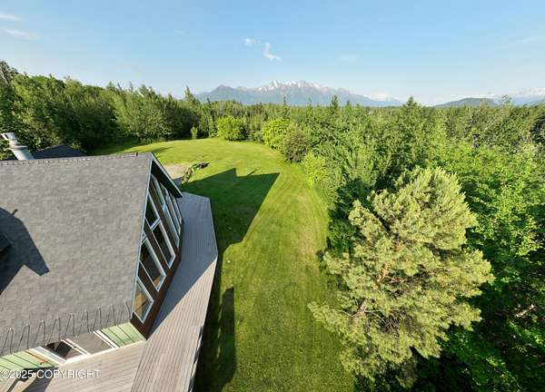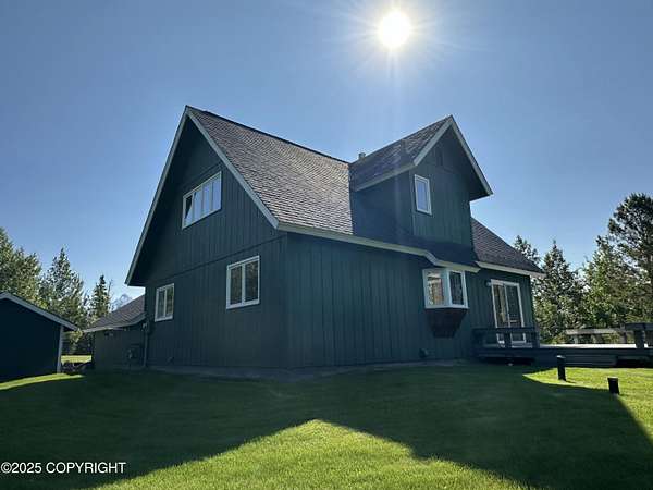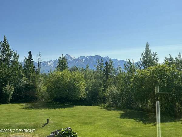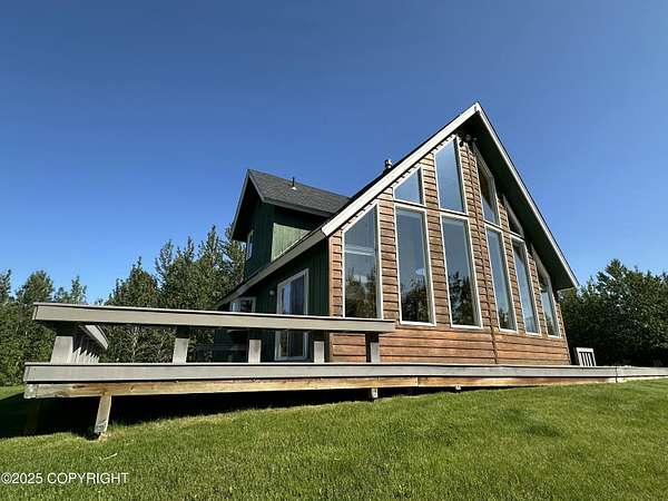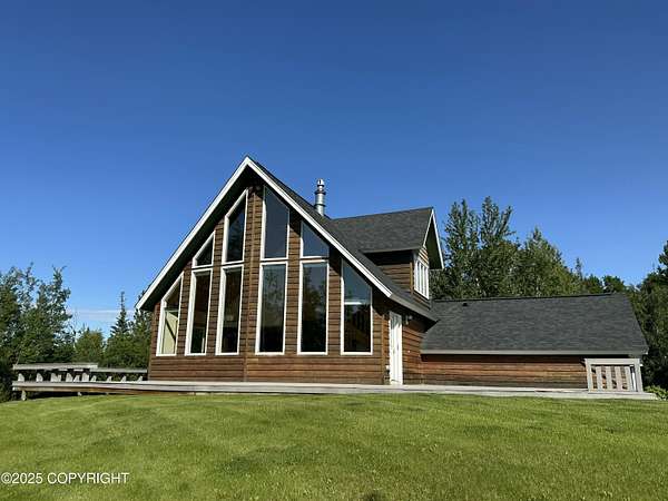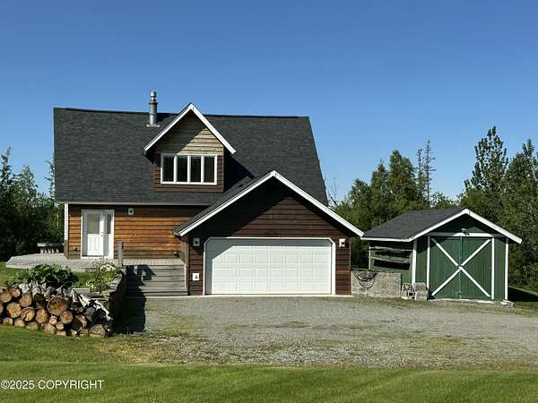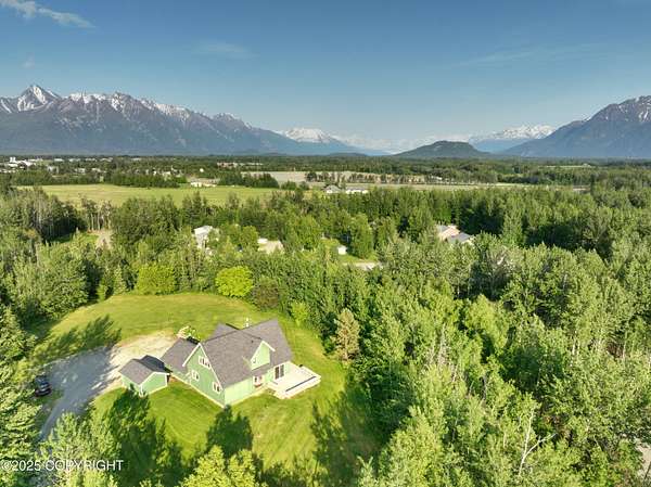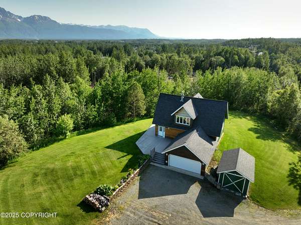 Stunning 3 bedroom house on almost 2 acres of land with mountain views. The wall of windows provides a grand living space with a stone gas fireplace. There is a large primary suite upstairs and ample garage space. It is a private from the neighbors and in a great area of Palmer with potential for better mountain views! The yard and deck would be great for families or entertaining.