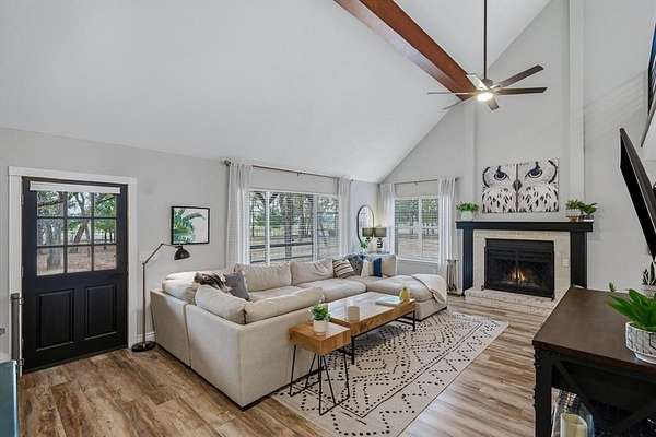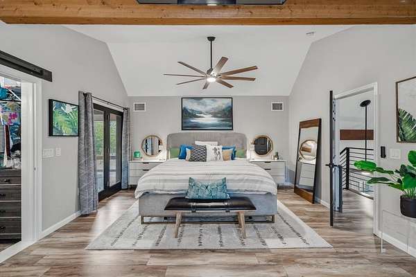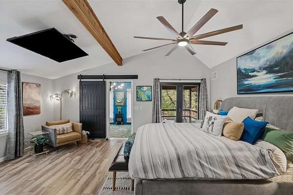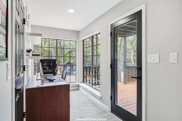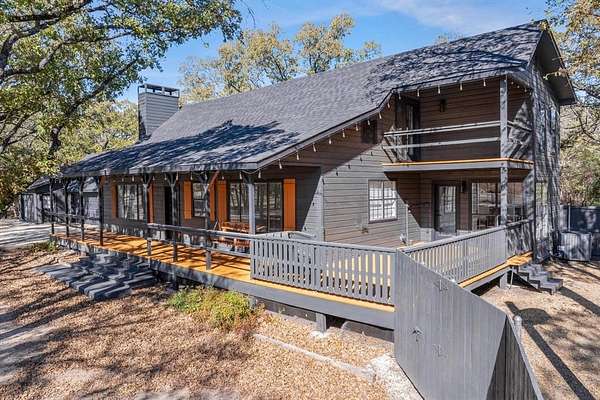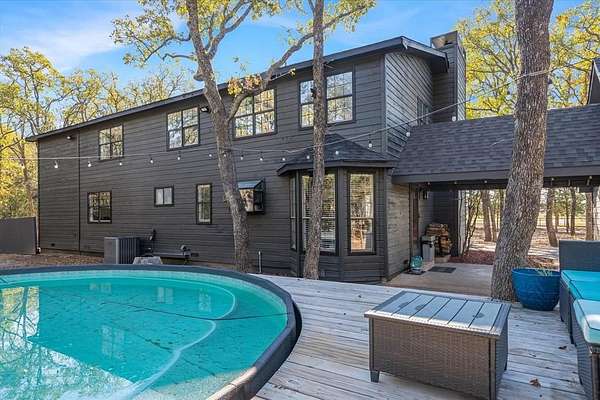Surrounded by mature trees, private walking trails, and peaceful East Texas scenery, this beautifully remodeled home in Poetry, Texas delivers a lifestyle few properties can offer. Nestled deep in the woods within a highly sought after area, this home blends privacy, character, and modern comfort with thoughtful upgrades throughout. Bold cedar plank siding, recently replaced roof & HVAC with duct work, whole home water filtration and softener system, monitored wireless alarm, and oversized front and back decks create a striking first impression and invite outdoor living year round. Inside, soaring vaulted ceilings with exposed wood beams, modern railings, and expansive windows flood the home with natural light and showcase the surrounding wooded views. Main living area is anchored by a cozy fireplace and flows seamlessly into the kitchen and dining space, creating an inviting layout ideal for everyday living and entertaining. Kitchen features granite, SS appliances, a pantry, and generous workspace designed for functionality and style. Home offers 2 spacious primary suites, each with large closets & private ensuite baths. One primary includes a dedicated office or nursery with oversized windows, providing a quiet and inspiring space for working from home or creative use. 2nd primary suite serves as a private retreat with dramatic ceilings, wood beam accents, and direct access to the outdoors. Upstairs loft style living area overlooks the main living room with soaring ceilings, offering flexible space for a second lounge, media room, or quiet escape. Outside, expansive decks, a covered breezeway for entertaining, & salt water above ground pool create a private backyard oasis surrounded by trees & natural privacy. 3 car garage provides excellent functionality, including one temp controlled bay ideal for storage or hobby use. Located approximately 45 min to Dallas, 25 min to Rockwall, and 20 min to Terrell for easy access to shopping, grocery, dining & entertainment.