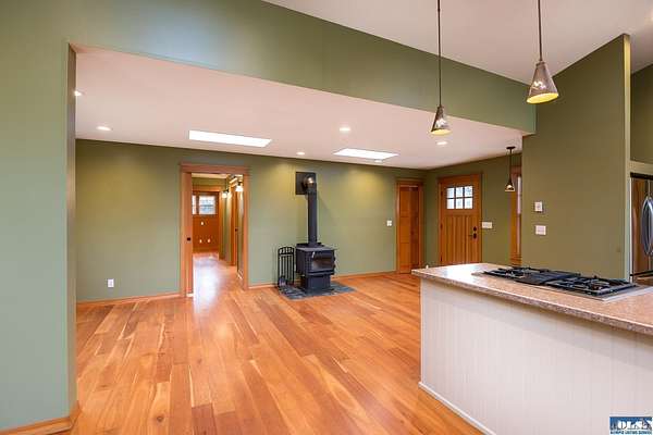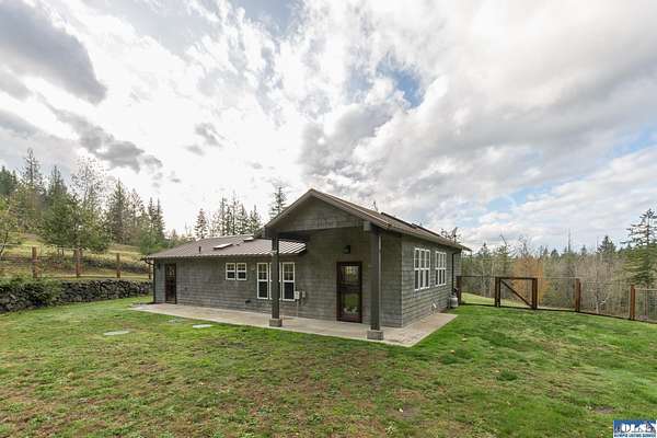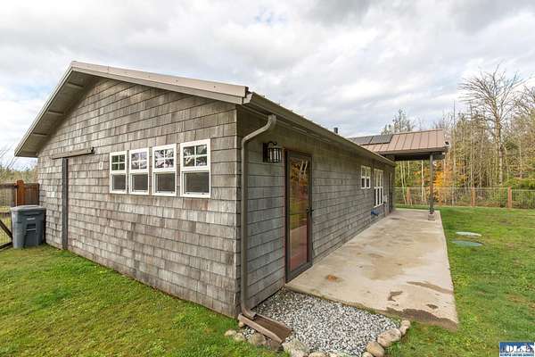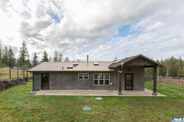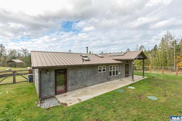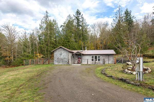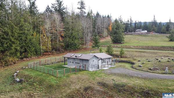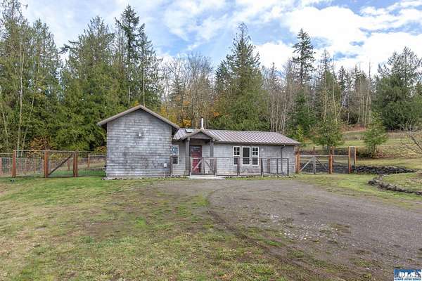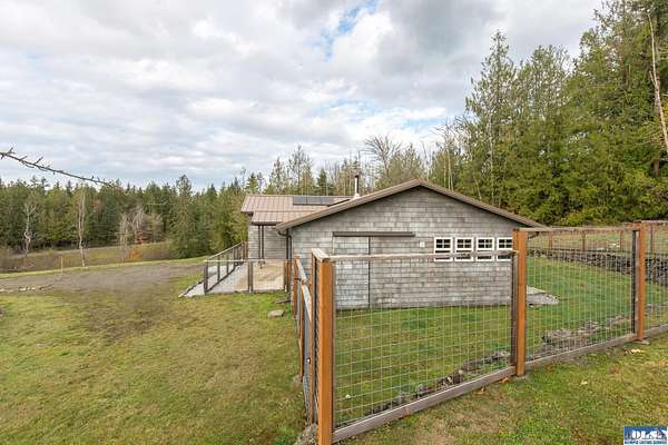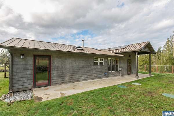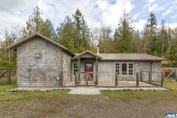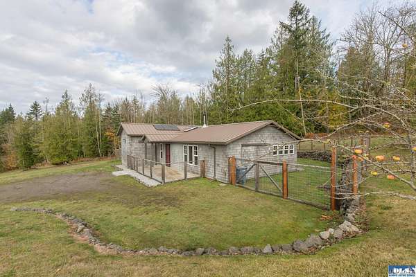 Nestled on an open, forested 5-acre lot, this charming cedar shingled home offers the perfect blend of privacy, comfort, and sustainable living. Tucked away in a serene woodland setting, the home features a durable metal roof, solar panel system, and a fully fenced backyard--ideal for pets to roam safely. Inside, you'll find beautiful wood floors, vaulted ceilings, and an open-concept living space that seamlessly connects the kitchen, dining, and living areas. The kitchen is equipped with stainless steel appliances and a countertop composter, appealing to eco-conscious buyers. The modest primary bedroom is complemented by a guest bedroom at the end of the hallway. The full bathroom conveniently doubles as a laundry area with washer and dryer hookups. Additional features include a spacious walk-in pantry with a built-in water filtration system, outside hot and cold water values on North side of the home, and a secured storage room for with locked access. Ideally located between Sequim and Port Townsend, this home offers easy access to Hwy 101 while maintaining a peaceful, off-the-beaten-path feel. A unique opportunity to own a cozy, move-in ready home with room to breathe and grow.