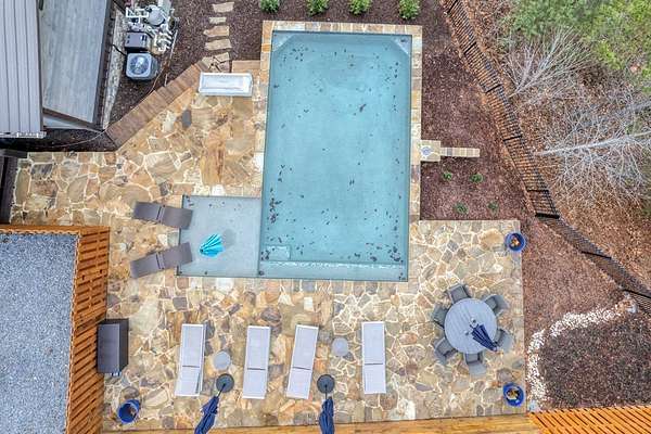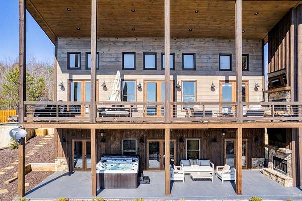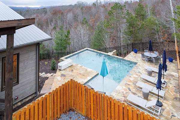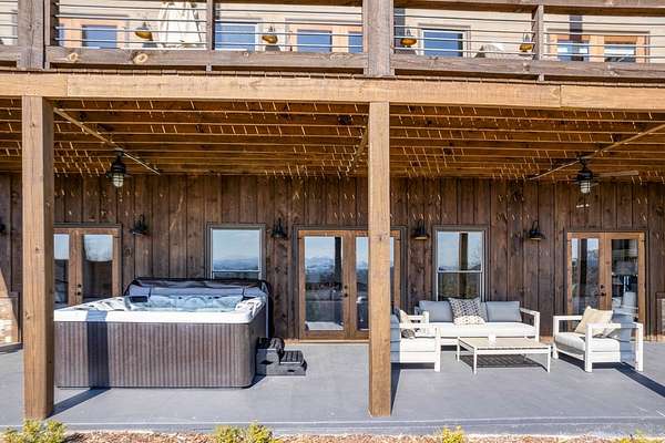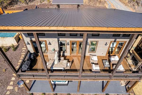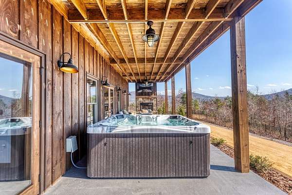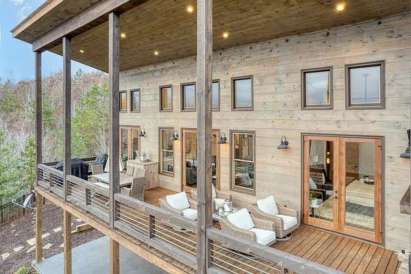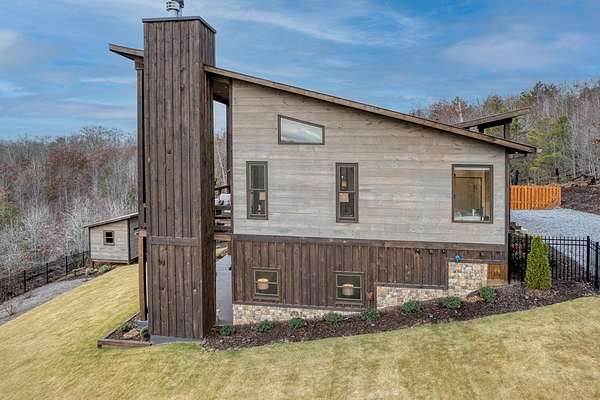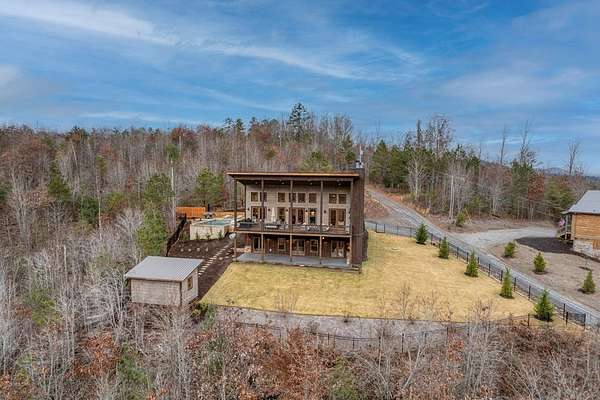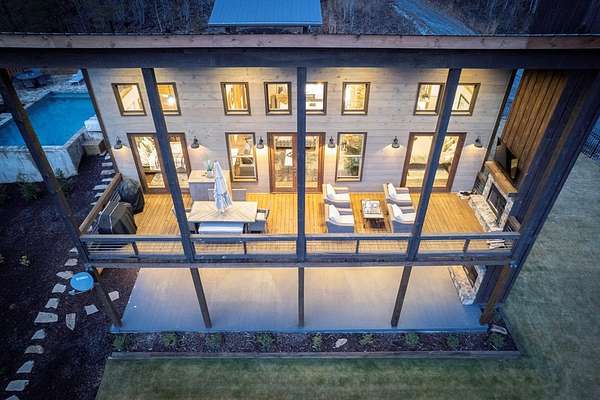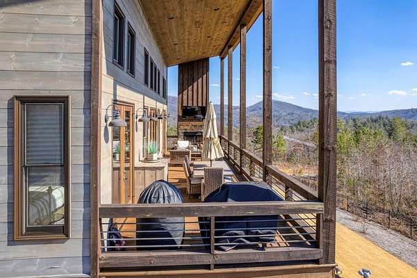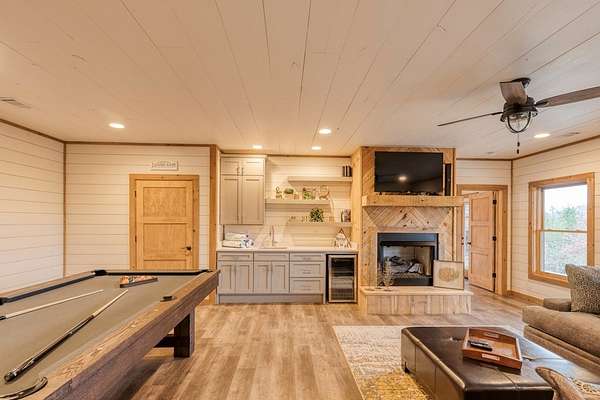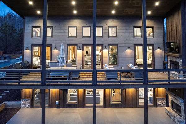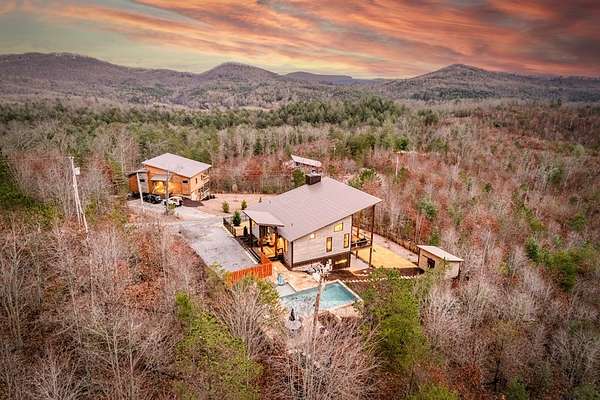 This luxurious Blue Ridge Mountain Escape offers unmatched features starting with a pristine and unique pool overlooking the mountain landscape, an element that immediately sets this property apart, along with an outdoor grill and a spacious backyard perfect for family fun; the expansive deck further enhances outdoor living with a fireplace, outdoor dining area, and a hot tub, allowing owners to sit in the hot tub or swim in the heated pool while watching the sunrise over the mountain range. Inside, the home boasts an open-concept modern-rustic kitchen and living space, complemented by a dedicated game room on the main level featuring a wet bar, wine cooler, fireplace, and pool table. The upper level hosts the King Suite with private deck access, mountain views, and a large walk-in bathroom with a classic standing tub and a wet-room style shower, plus a second bedroom also offering private deck access, mountain views, and a naturally lit walk-in shower. The lower level includes two King Bedrooms, each with a personal bathroom and smart TV, as well as a convenient laundry room, while the lower back porch provides an additional fireplace and a roofed space for games and outdoor activities, all contributing to a property that is highly sought after and won't last long, so appointments should be made today.