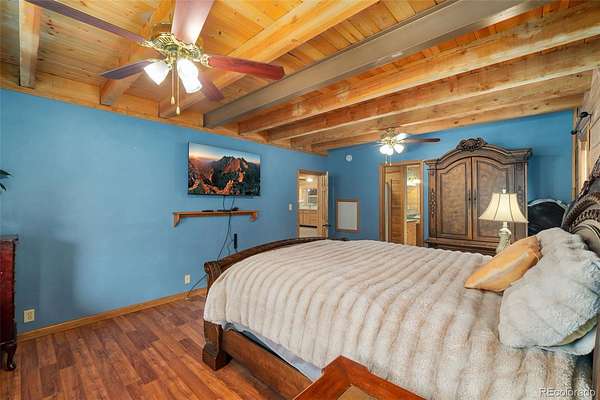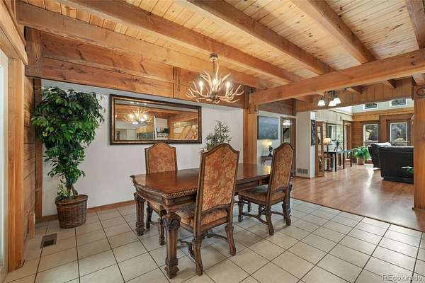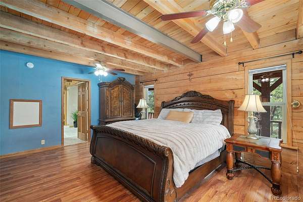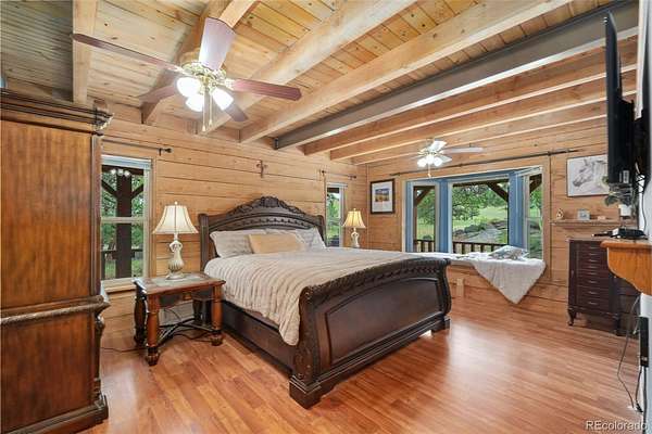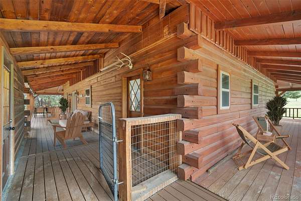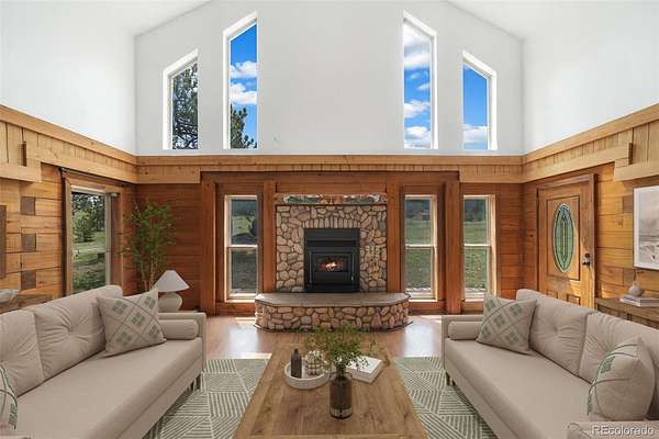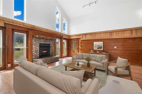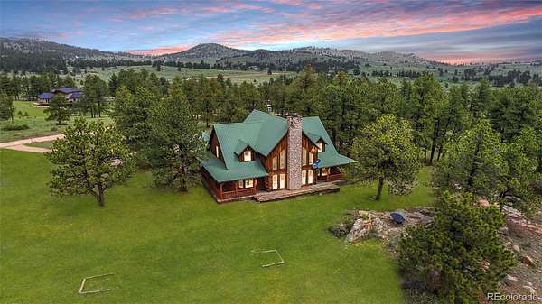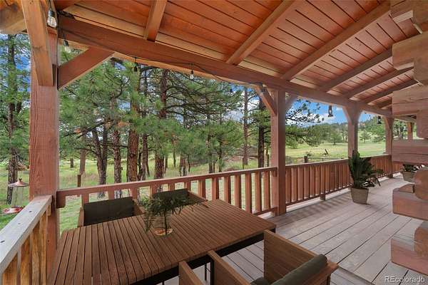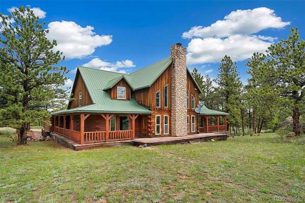 Tucked away on 3.52 wooded acres in Glacier View Meadows near Red Feather Lakes, this custom log home offers the privacy, craftsmanship, and mountain setting that define Colorado living. Surrounded by towering pines, it’s an ideal full-time residence, second home, or year-round vacation retreat. Built with distinctive sinker cypress logs, this one-of-a-kind Colorado cabin showcases timeless character throughout. Soaring cathedral ceilings, exposed tongue-and-groove beams, and hand-carved details create a warm, authentic feel. The great room features a dramatic fireplace and striking carved staircase, while the kitchen and dining area provide inviting space for everyday living and entertaining. The primary suite includes a five-piece bath and dual walk-in closets, and a loft-style recreation area offers flexible additional living space. Outdoor living shines with a wraparound deck, hot tub, and peaceful forest views under star-filled skies. Additional highlights include a heated two-car garage, shop or workout room, and a 20x24 pole barn for storage and hobbies. New water heater and 2 year of furnace provide peace of mind.
