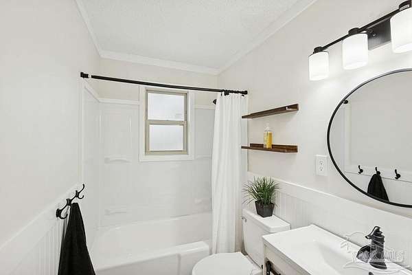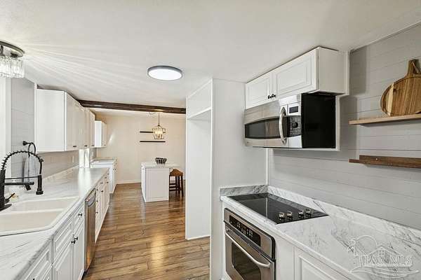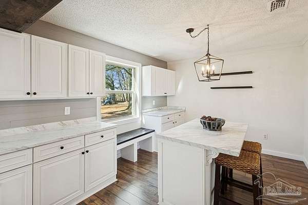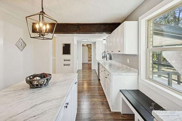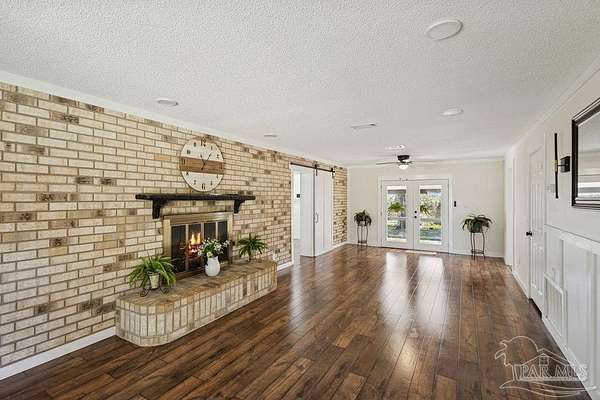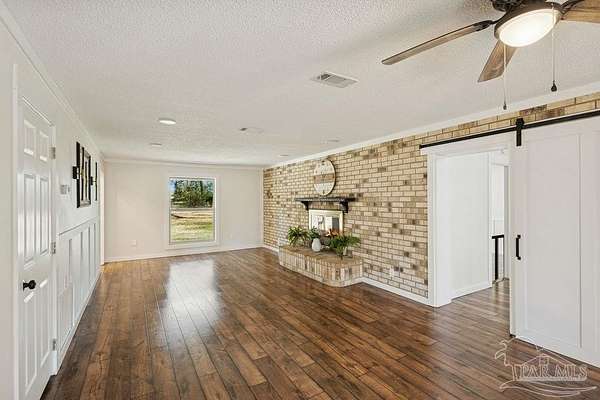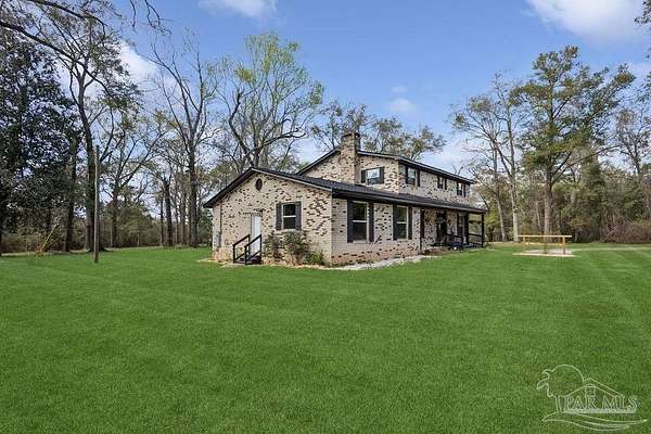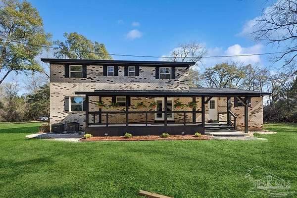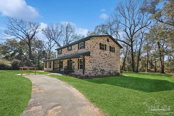Fully renovated 3,190 sq ft all-brick home situated on 2.3 private acres in Chumuckla, FL. Renovated top to bottom, this property offers space, flexibility, and major system updates for true move-in-ready living. Inside, you'll find engineered laminate flooring, two spacious living areas downstairs, and two back-to-back fireplaces that create warmth and character between the main gathering spaces. The large, centrally located kitchen flows seamlessly into a spacious formal dining room, ideal for entertaining or hosting family gatherings. A convenient half bath is located off the main hallway for guests. Upstairs features four bedrooms and two full bathrooms, offering a functional layout with sleeping quarters separate from the main living areas. The downstairs secondary living area offers excellent flexibility and could easily be converted into a primary suite with a full bath if desired, making this home suitable for multi-generational living or a first-floor master option. The oversized mudroom/laundry room provides additional storage and practicality. Major upgrades include a brand-new roof, new heat pump, all new HVAC units (inside and out), new electrical panel, and brand-new windows. Step outside to a covered back porch overlooking the quiet backyard - the perfect place to unwind and enjoy the peaceful setting. With 2.3 acres of usable land and a fully updated brick exterior, this property offers the best of country living with room to grow.