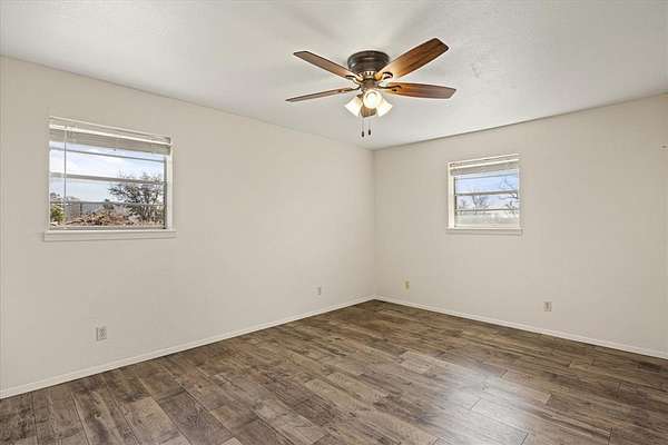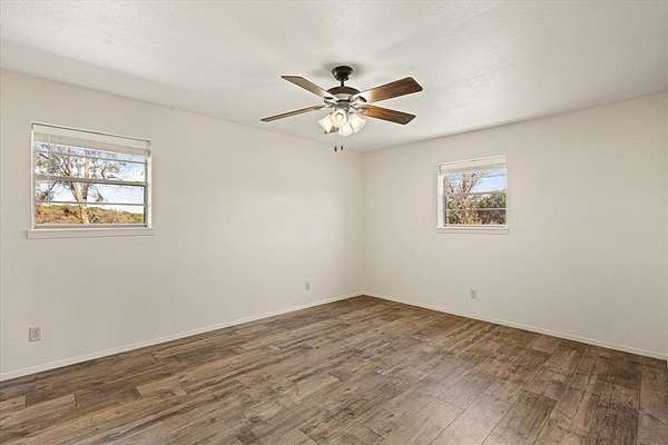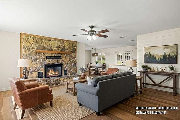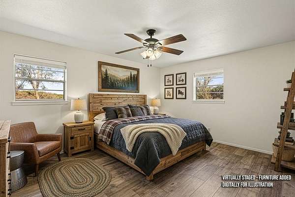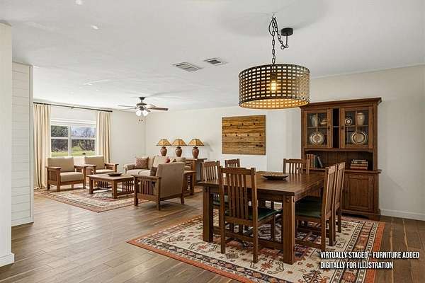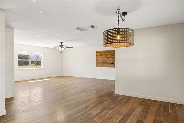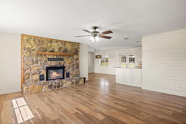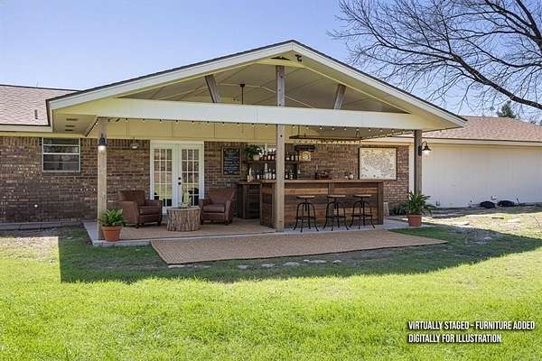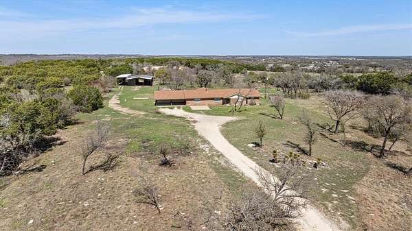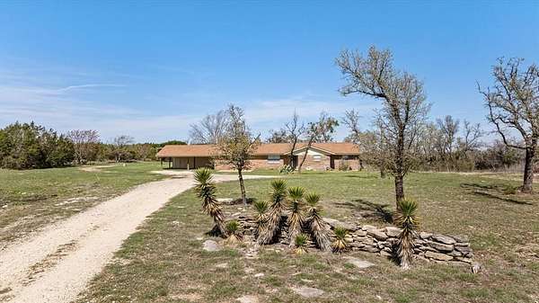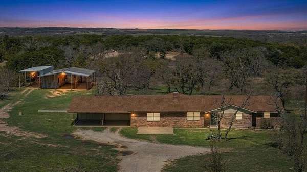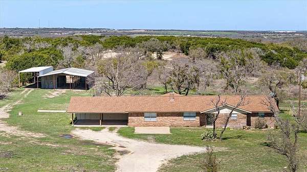 10-acre horse property located just outside Stephenville, approximately 6.8 miles from downtown Stephenville and 5.2 miles from 377 Arena. The 3-bedroom, 2-bath brick home offers approximately 2,190 square feet with an open floor plan that includes two living areas anchored by a wood-burning fireplace, with the dining area located just off the kitchen. Flooring has been updated throughout the home, with brand new flooring in the bedrooms, and additional interior updates include fresh paint, new ceiling fans, updated door hardware, a remodeled hall bathroom, and a new dishwasher. The home also includes a large laundry room and a dedicated office space. A covered back patio overlooks the horse pasture and connects to a large fenced backyard, providing comfortable outdoor space for relaxing or entertaining. Horse improvements include a roughly 35x60 barn with four stalls with turnout into a pasture, along with a large tack and feed room running along one side of the barn and an additional storage area. Water lines, electricity, and lighting have been added, and a 16-foot covered area provides space for trailer or RV parking with a 30-amp plug. A roughly 120x200 open riding arena provides space for riding or training. The acreage is mostly flat with native grasses and a mix of cedar and hardwood trees, with more open pasture toward the back of the property. The property has direct frontage on FM 205 with a gravel drive providing access from the road. The home operates on well water and septic and features all-electric appliances, offering a rural setting while remaining convenient to Stephenville. Seller will consider offering up to $10,000 toward buyer closing costs or concessions.