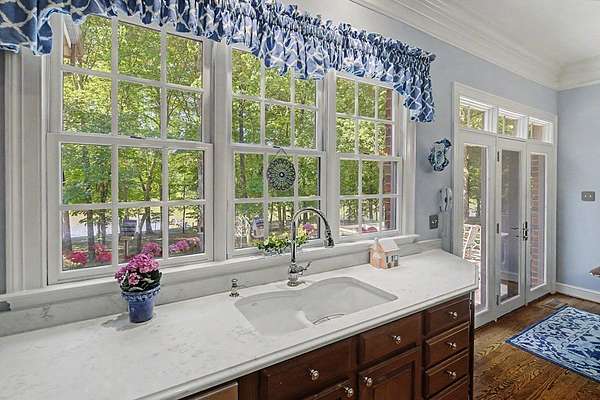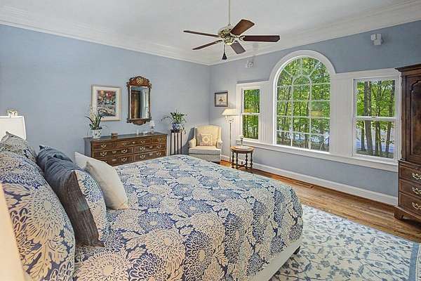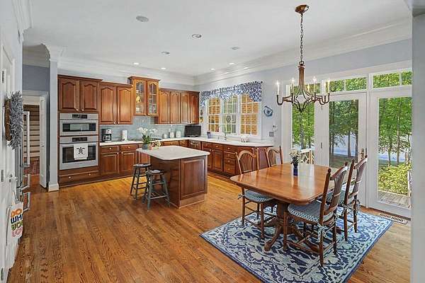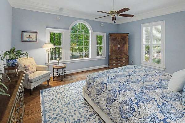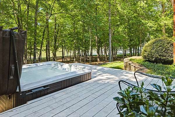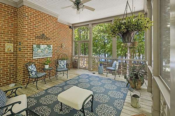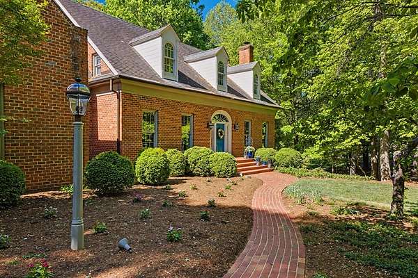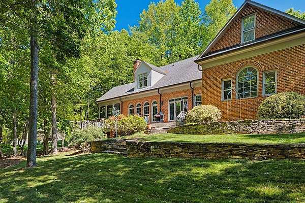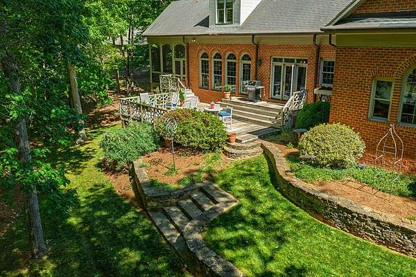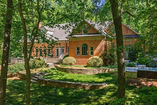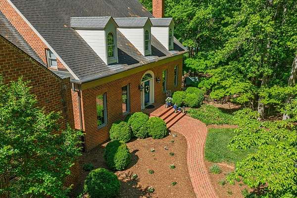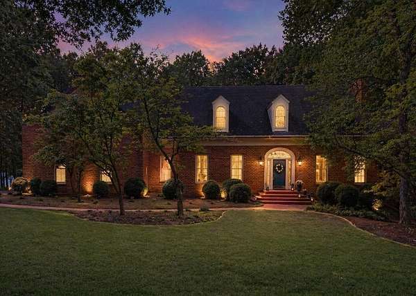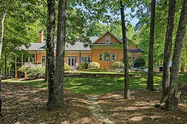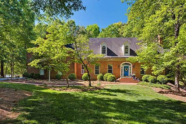 Timeless traditional brick home with low country charm, situated on 3.55 private waterfront acres. This beautifully designed property offers 4,552 sq ft of living space plus an unfinished basement. A grand 19-foot foyer welcomes you with a stunning three-tier solid brass chandelier. The home features 10-foot ceilings on the main level & 9-foot ceilings upstairs, creating an open & airy feel throughout. First-floor highlights include the foyer,a formal living room with a marble-surround gas-log fireplace & a formal dining room with a solid brass chandelier. a spacious primary suite with his & hers walk-in closets & an ensuite with his & hers vanities. Private exit to tiered deck leads to hot tub. Wood flooring runs throughout the first floor. There is raised-panel wainscoting in the family room & a slate surround wood-burning fireplace. Three elegant arched windows, surrounded by lovely molding & trim details,overlook the expansive deck & water. A gorgeous screened porch is just on the side of the family room. The spacious kitchen, updated in 2018, is equipped with a Bosch refrigerator, built-in oven & microwave, dishwasher, Thermador cooktop, cherry cabinetry, a built-in desk or bar area, & quartz countertop, updated backsplash. A 1/2 bath, large laundry room & back stairway complete the 1st floor. 2nd floor has 3 bedrooms & 2 baths, huge bonus room with 2 office spaces, & recreation area. Outdoor features include stone walls, an expansive deck ideal for entertaining, 2-car garage, & beautifully landscaped grounds with serene waterfront views. This property offers a perfect blend of elegance, comfort, and peaceful waterfront living. A must see, too much to describe in a little space! Get your pre-approval letter, your buyer agent & come see this custom-built beauty.